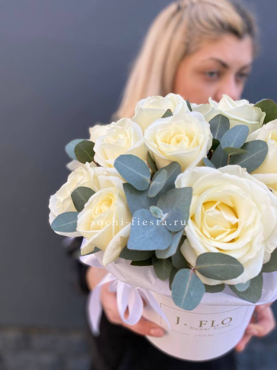 белые розы с эвкалиптом в боксе 16.