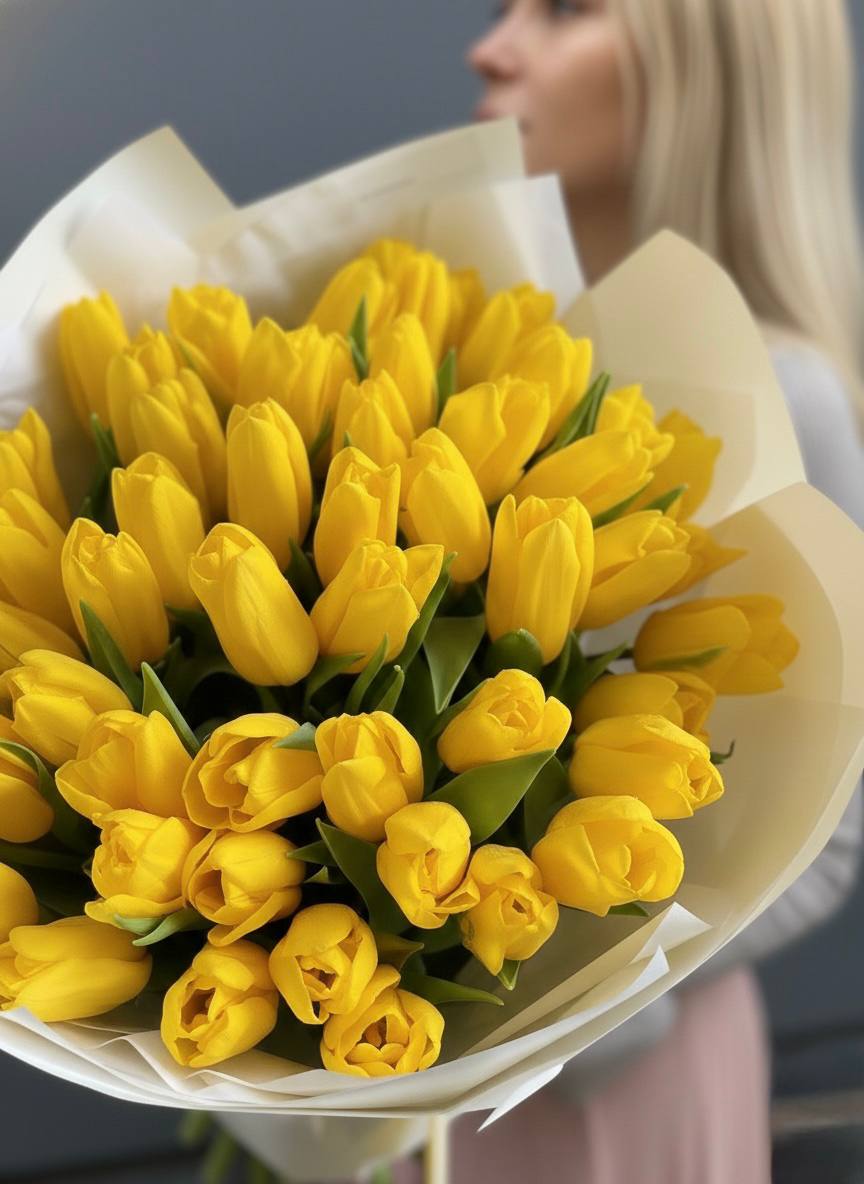 Пятьдесят один тюльпан собран в плотный монохромный букет, где каждый бутон держит форму и направление. Яркая весенняя палитра создаёт мощное визуальное присутствие в любом пространстве.