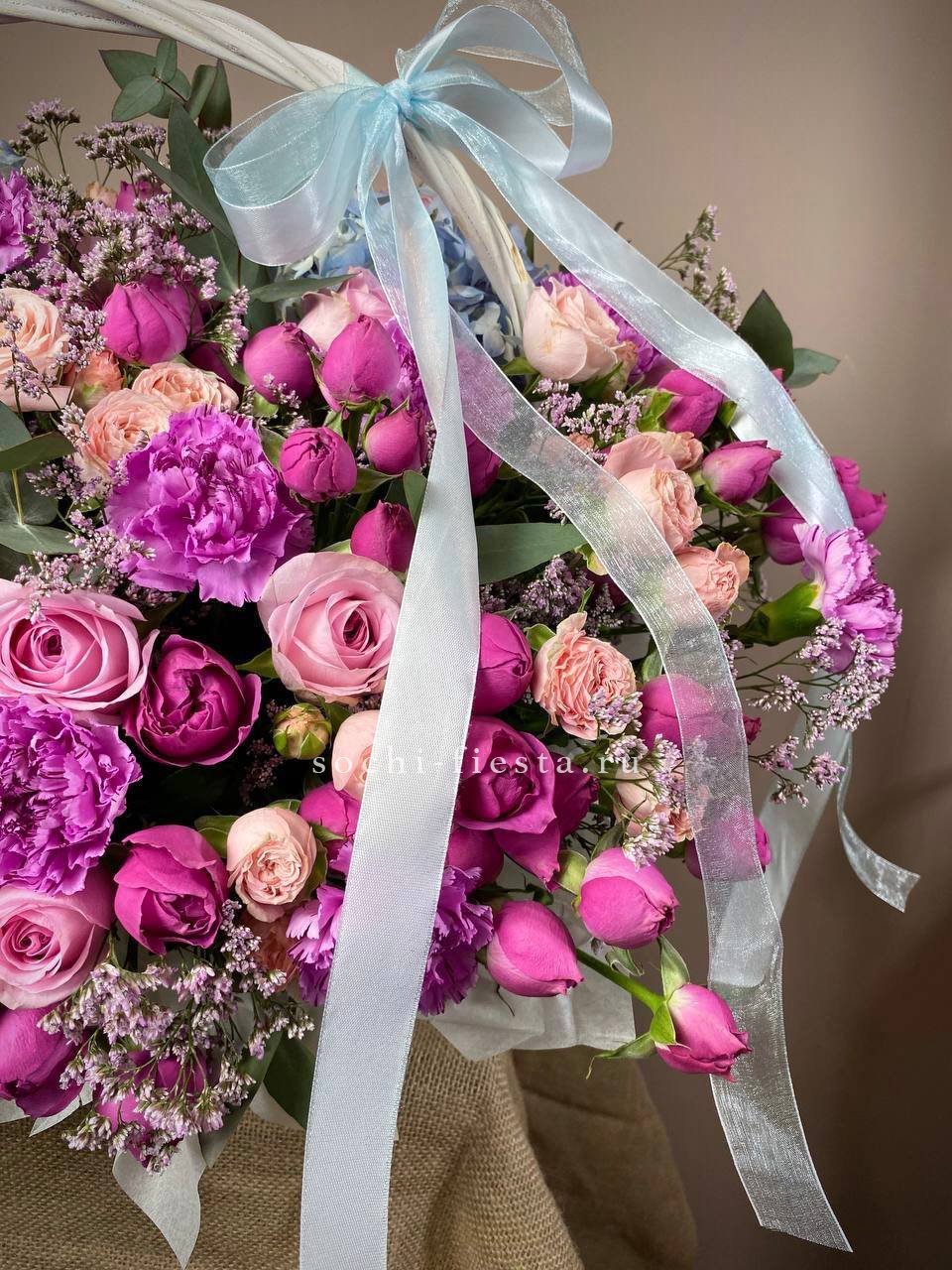 Корзина в лавандовых тонах объединяет пышные соцветия гортензии, кустовые и классические розы с воздушным лимониумом. Эвкалипт добавляет графику и свежесть всей композиции.