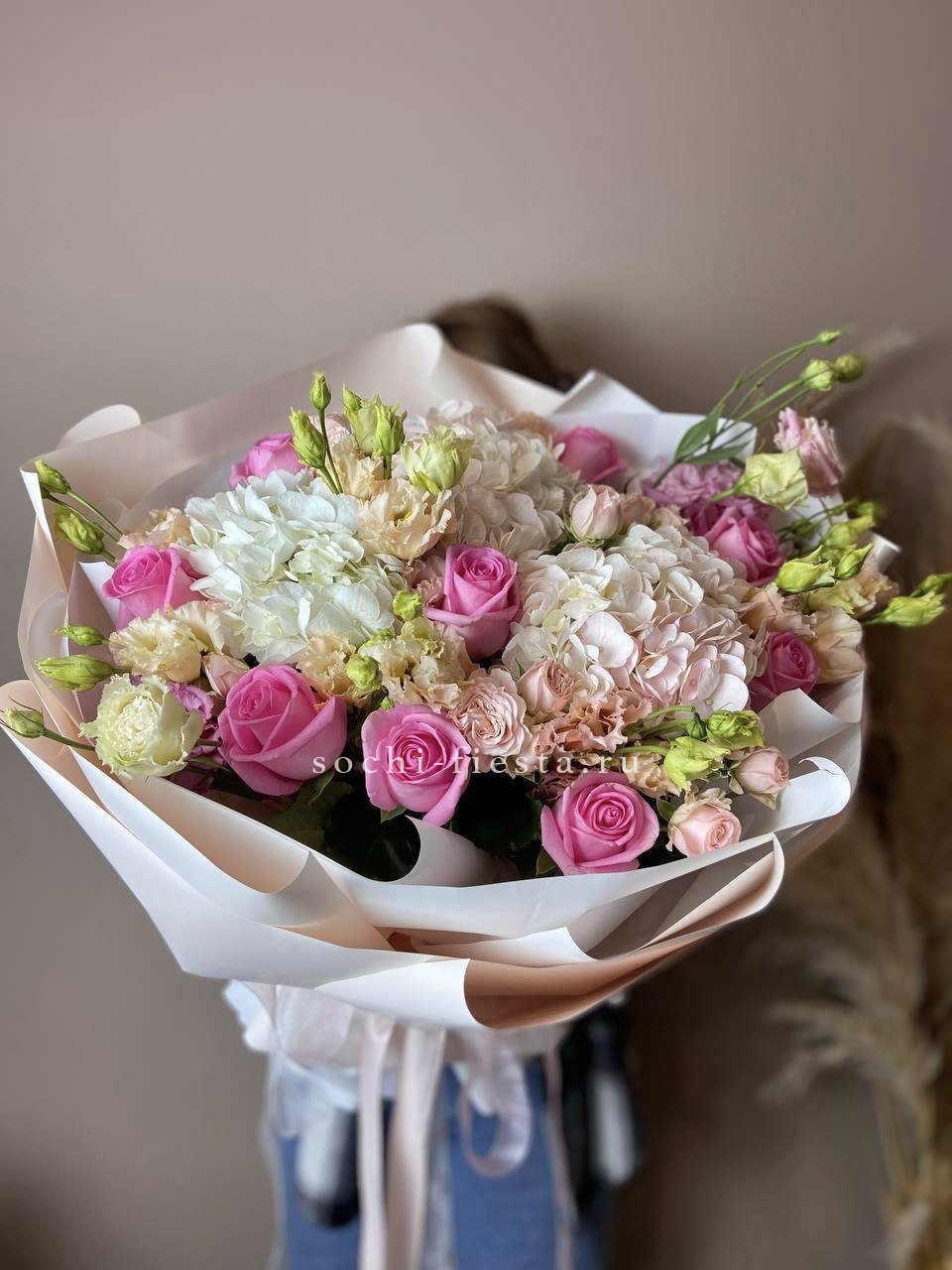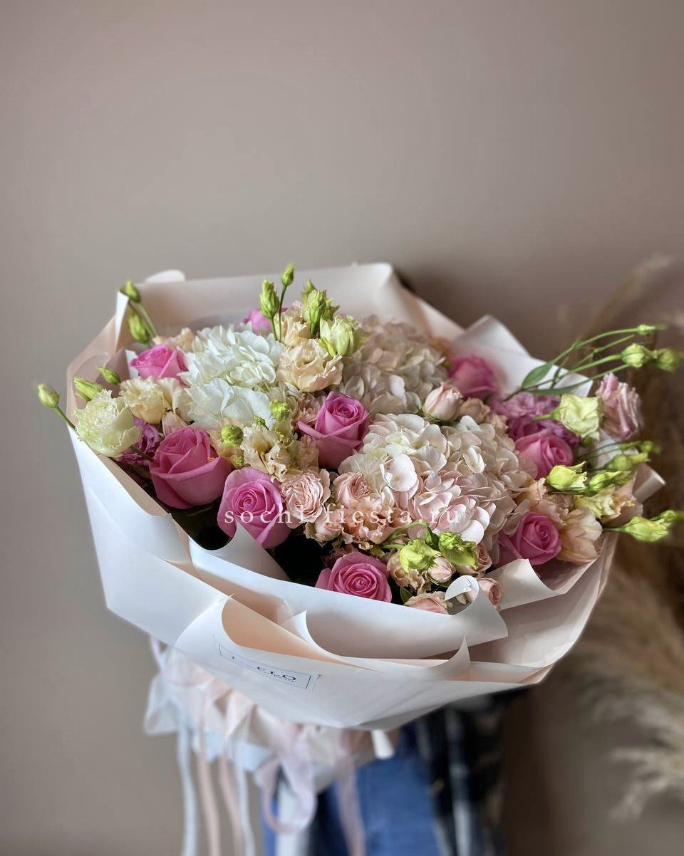Пышная композиция в розовой гамме с плотными шапками гортензии и многоярусными бутонами эустомы. Кустовые розы добавляют объём, а эвкалипт создаёт воздушную раму вокруг центральных цветов. Авторская упаковка с тишью завершает образ.