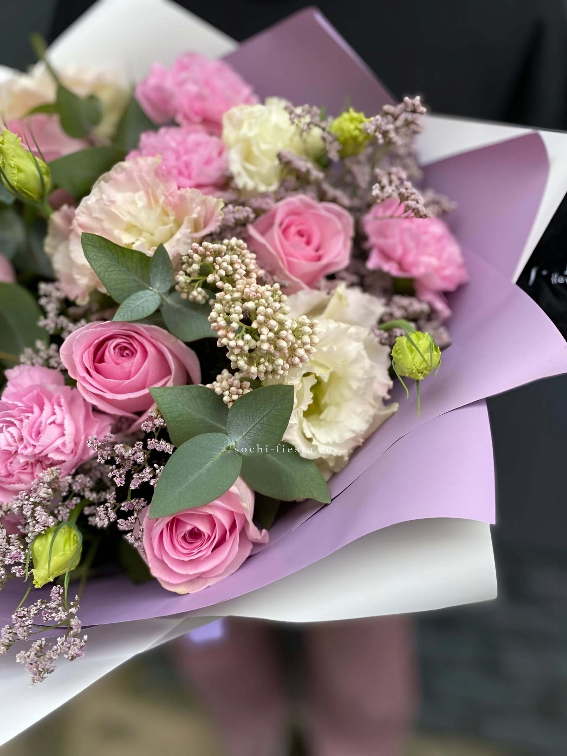 Пышная композиция объединяет крупные соцветия гортензии с бархатными розами и воздушной эустомой. Мисти бабблс и диантус создают мягкую дымку вокруг центральных бутонов. Веточки эвкалипта добавляют свежести и завершают образ.