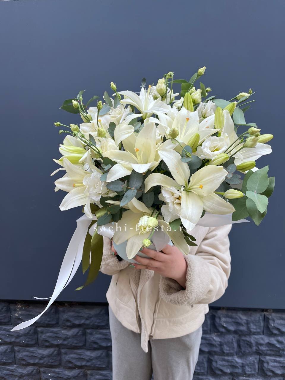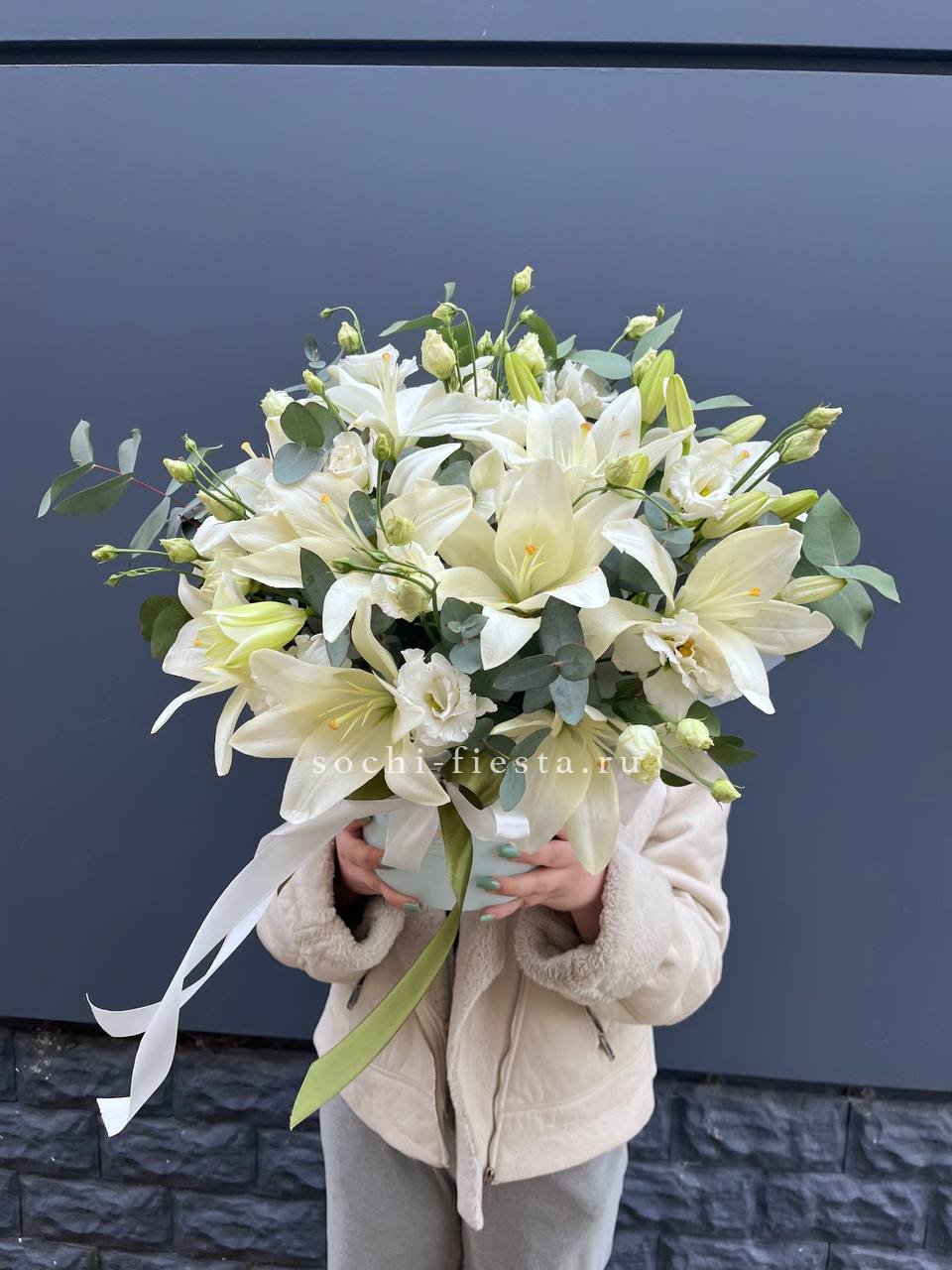 Крупные соцветия лилий соседствуют с воздушной эустомой, образуя выразительную композицию. Эвкалипт обрамляет бокс свежей зеленью, завершая гармоничную картину.
