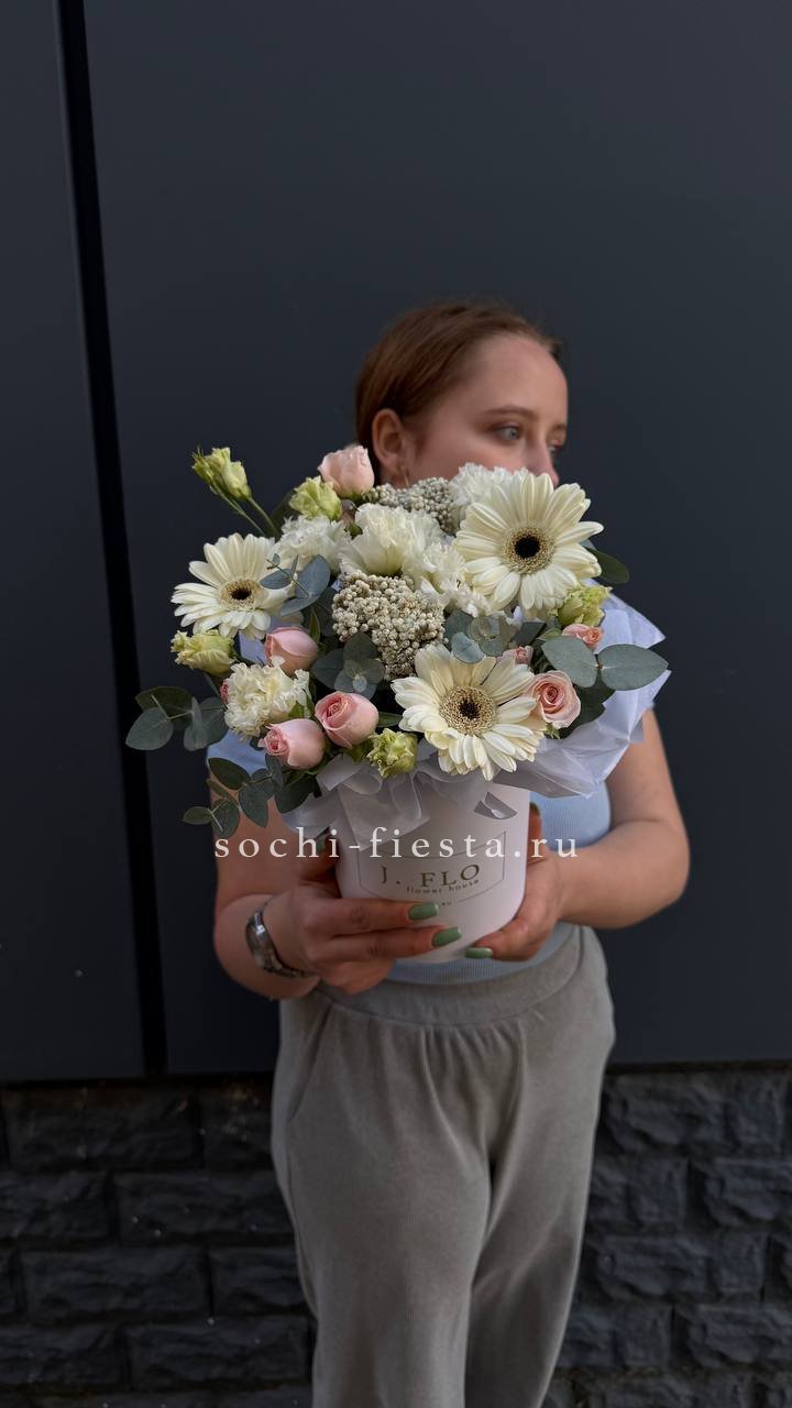 Белые розы встречаются с лиловым диантусом и кремовой эустомой в круглом боксе. Озотамнус и эвкалипт создают фактурный фон для цветочной композиции.