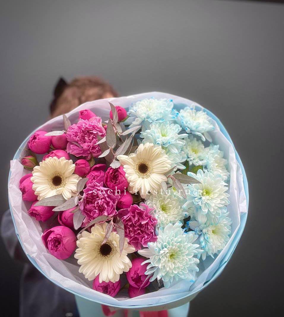 хризантемы кустовая, геребры, диантусы, пионовидные розы Мисти Бабблс, эвкалипт,  лента, упаковка.