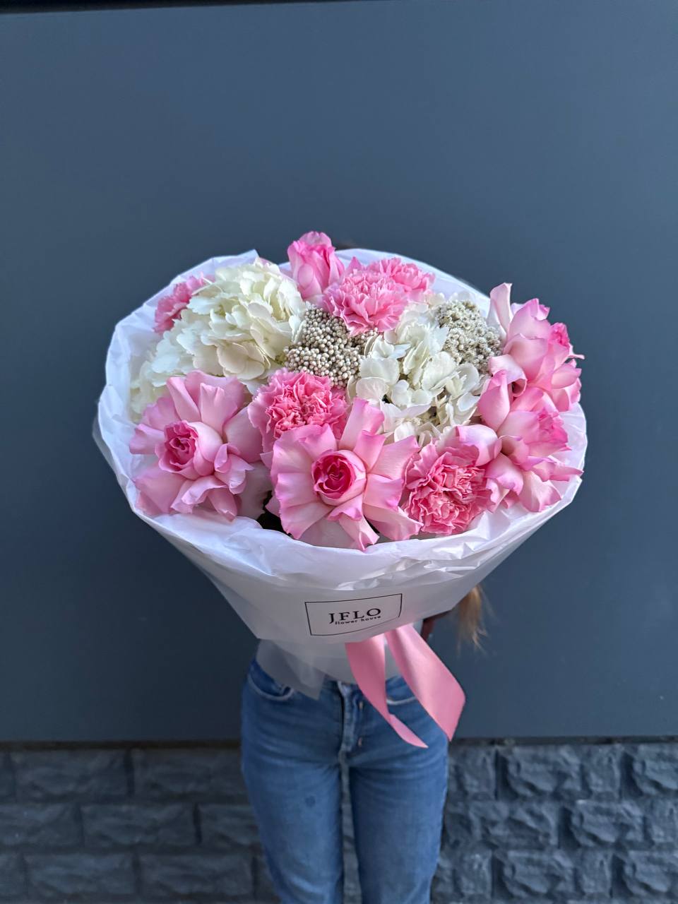 Розовые розы раскрываются среди воздушных соцветий гортензии и мелких бутонов диантуса. Озотамнус добавляет композиции лёгкость и объём. Букет собран плотно и держит форму без лишних деталей.