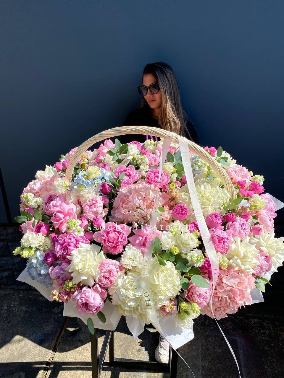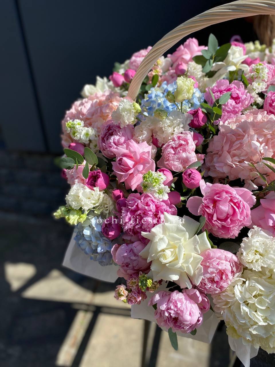Розовая гамма раскрывается через махровые пионовидные бутоны и классические розы с плотной текстурой лепестков. Эвкалипт вплетается в композицию, создавая свежий акцент.