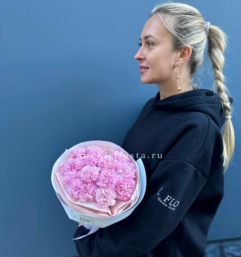 Диантусы с их густыми бутонами и резной формой лепестков выглядят графично и современно. Белый цвет усиливает архитектурность линий и создаёт чёткий визуальный ритм.