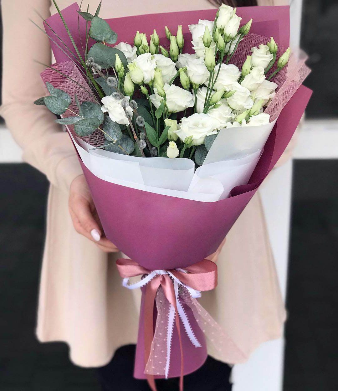 Сто один стебель белоснежной эустомы с многоярусными бутонами собраны в воздушный букет. Каждый цветок напоминает миниатюрную розу и вместе они образуют лёгкую скульптурную форму.