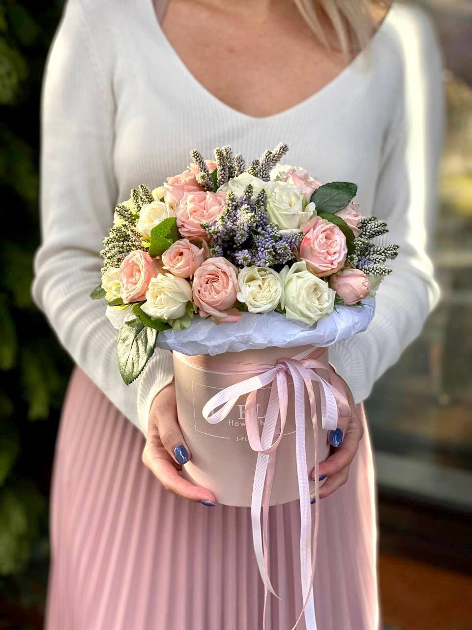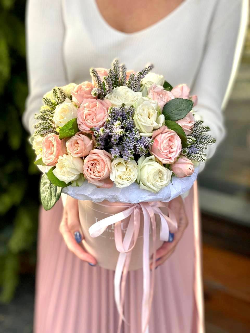 Пышная корзина с лилиями и гортензией собрана так, чтобы каждый цветок был виден и раскрыт. Розовые оттенки бомбастика перетекают в лиловый лимониум, создавая мягкую градацию. Эустома и диантус добавляют воздушности, эвкалипт завершает форму.