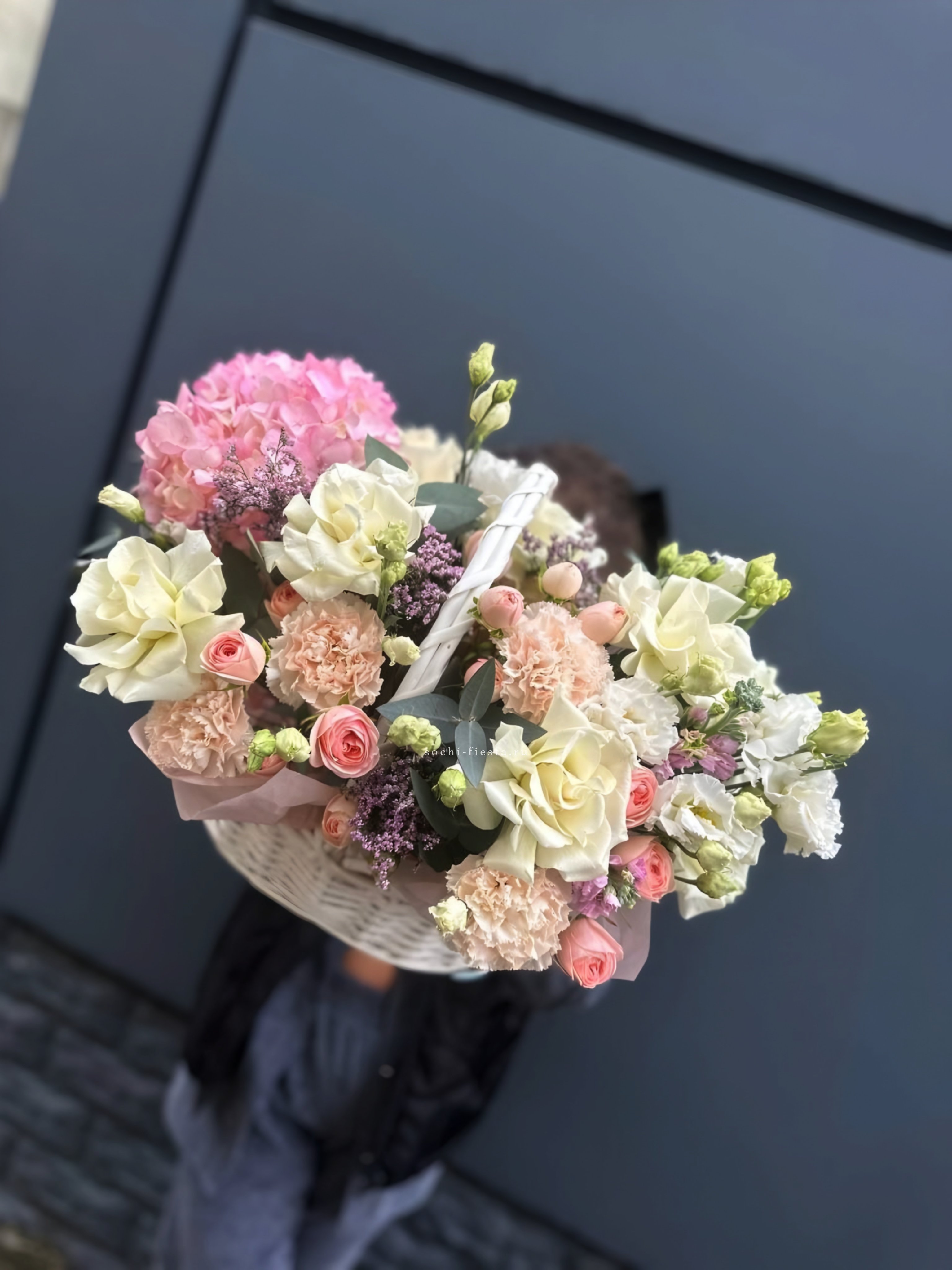 гортензия, бомбастик, диантус, лимониум, лилия, эустома. эвкалипт, корзина малая.