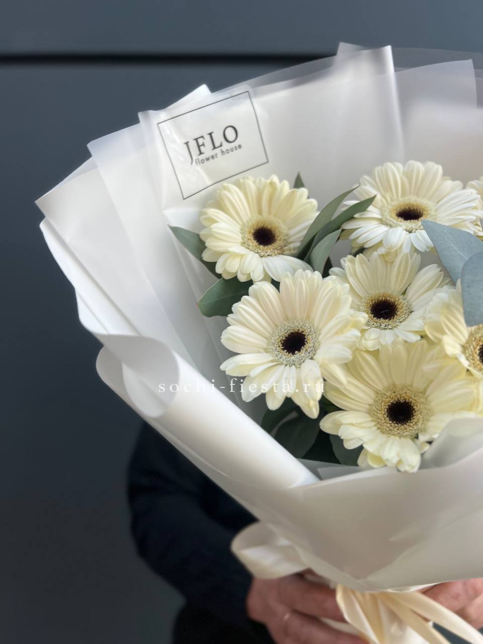 Семь голландских гербер собраны в лаконичный букет, где цвет можно выбрать по настроению. Крупные бутоны с чёткой графикой лепестков держат форму долго и радуют насыщенностью оттенка.