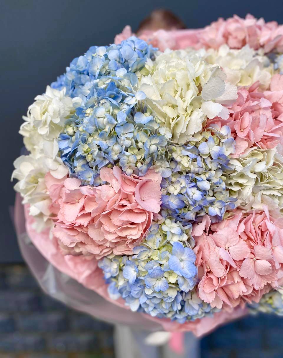 Одиннадцать соцветий гортензии собраны в объемную композицию с естественной воздушностью. Каждая головка раскрывается множеством мелких лепестков, создавая плотное цветовое облако.