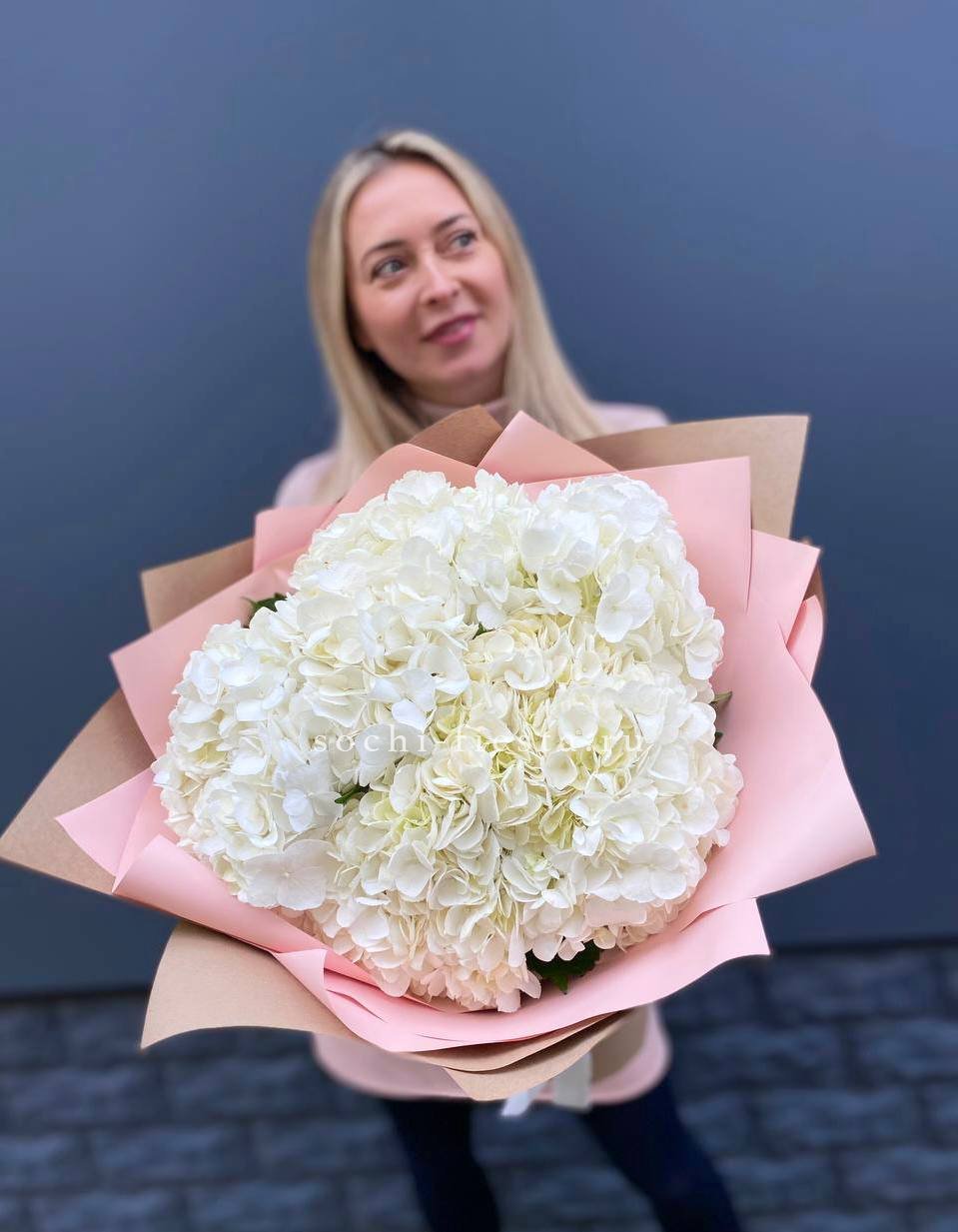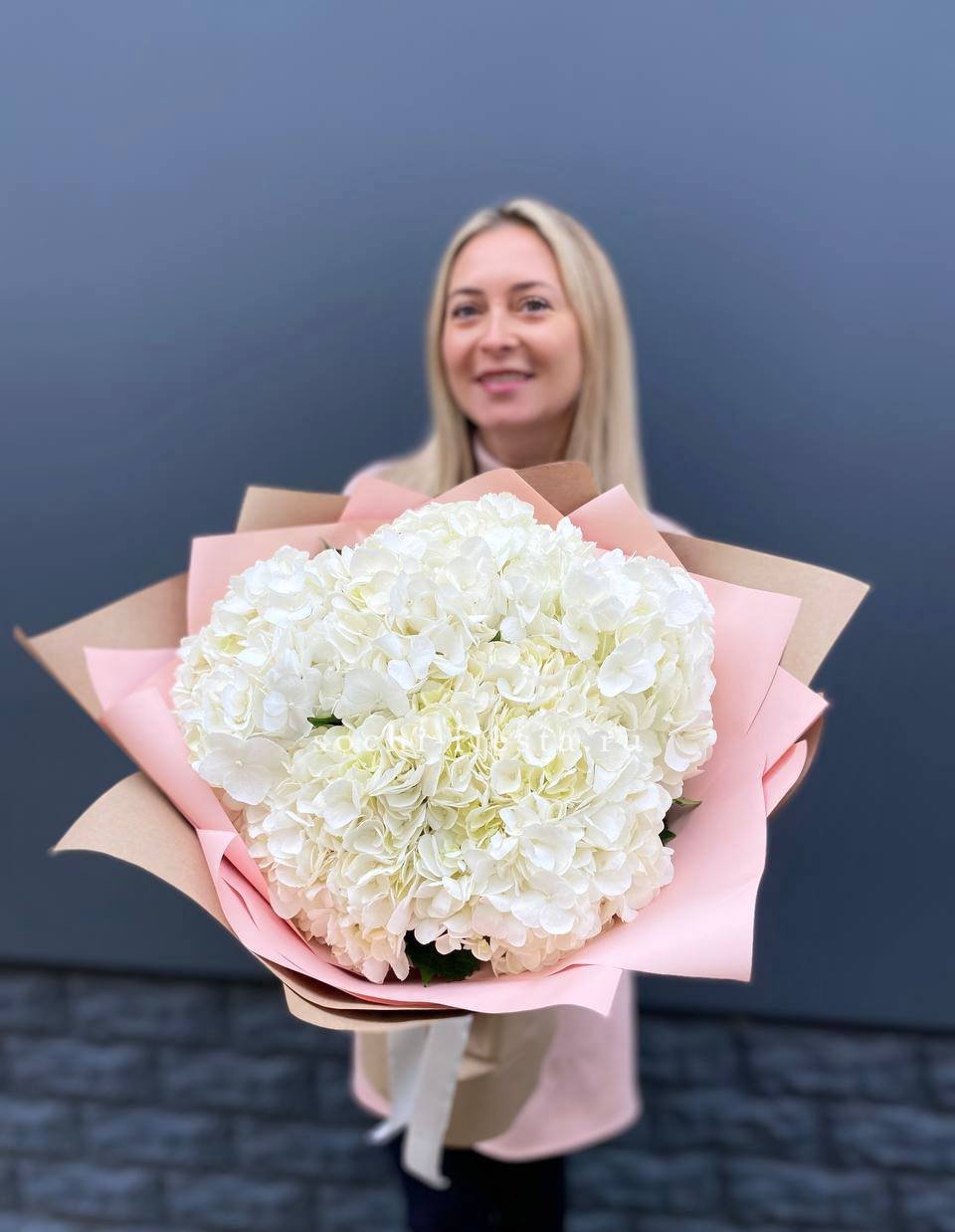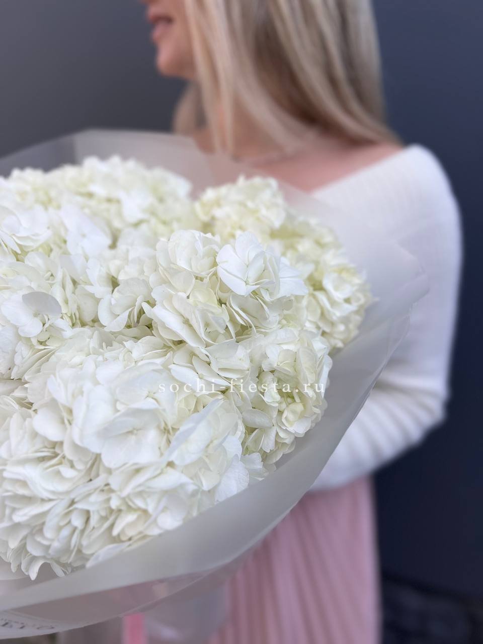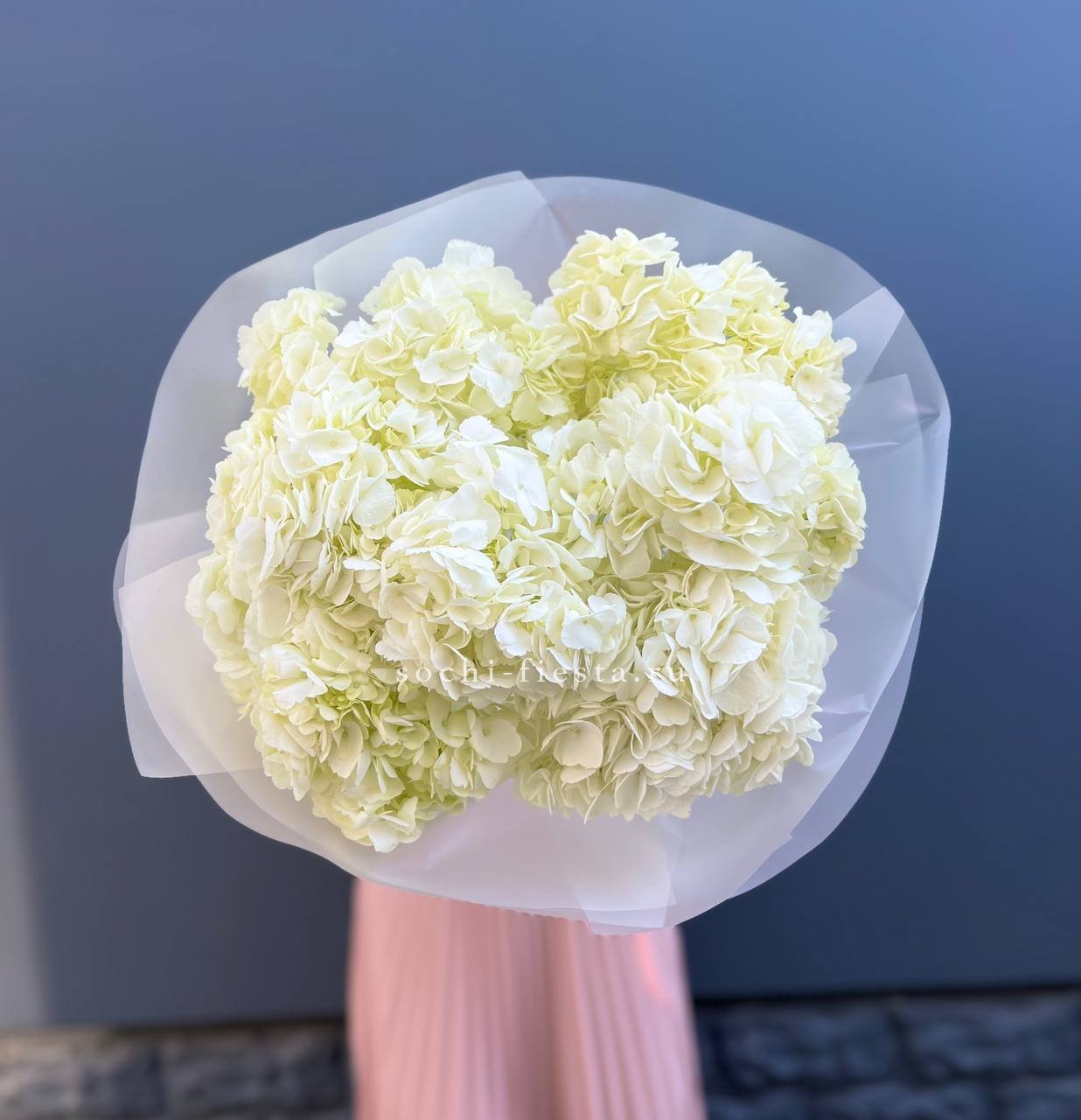 Воздушные шапки соцветий собраны в пышную охапку белоснежного цвета. Гортензия создаёт объёмную текстуру и заполняет пространство мягким природным светом. Букет для тех, кто ценит чистоту линий и естественную красоту.