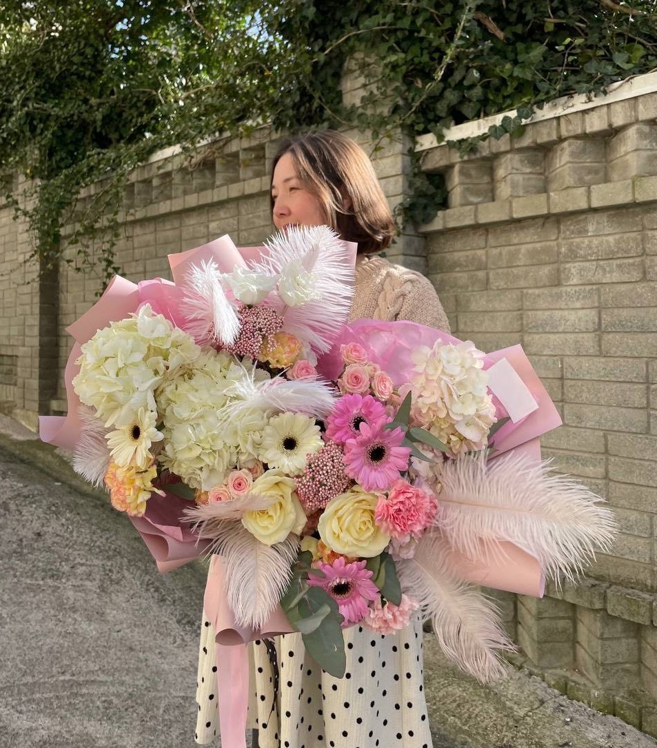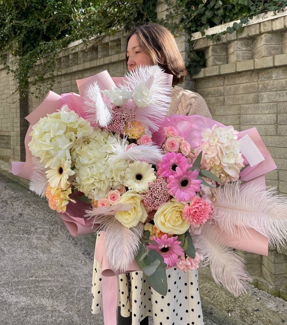 Пышные соцветия гортензий перекликаются с герберами и розами, создавая многослойную композицию с выразительной глубиной. Озотамнус и перья добавляют воздушности, а эвкалипт собирает все оттенки в единый ритм. Букет для тех, кто видит красоту в деталях.