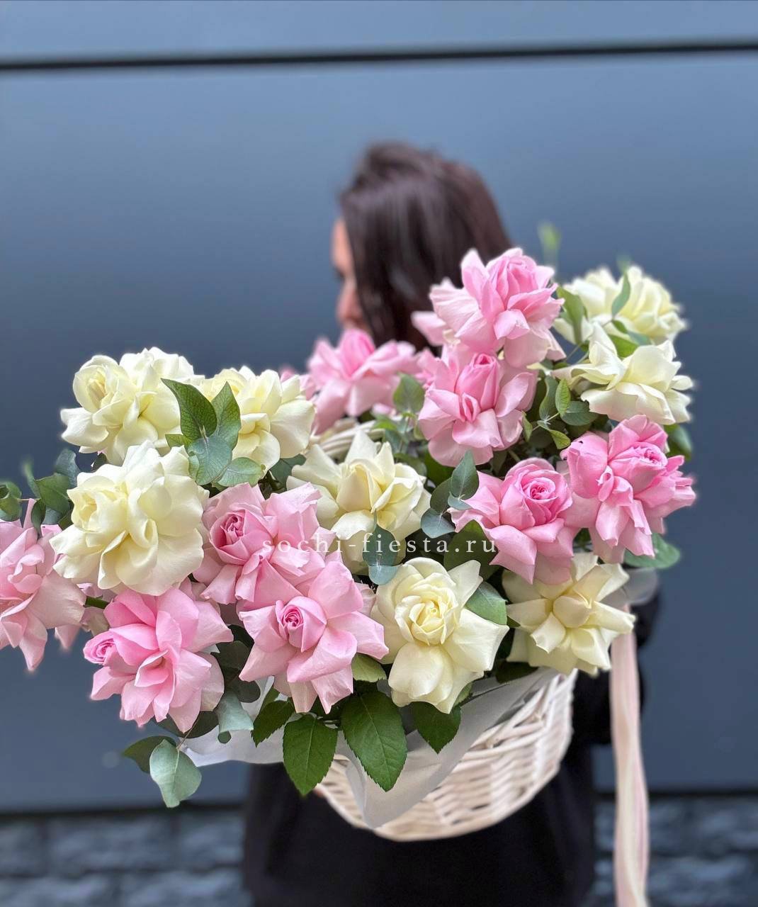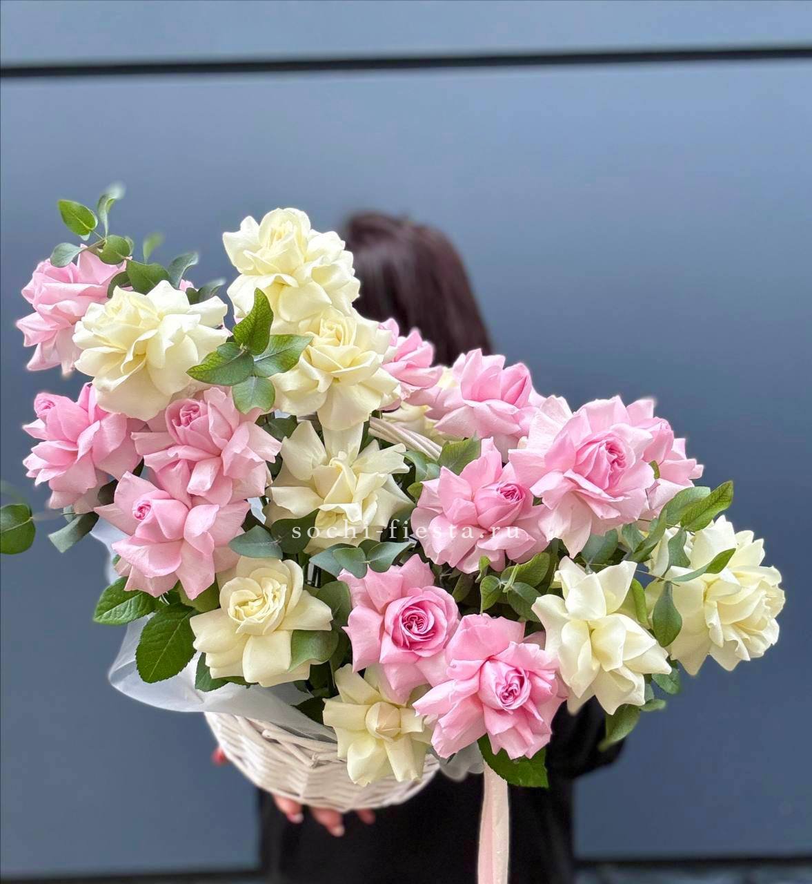 розы, пионовидные кустовые розы, диантусы, эвкалипт, лента, дизайнерская упаковка.