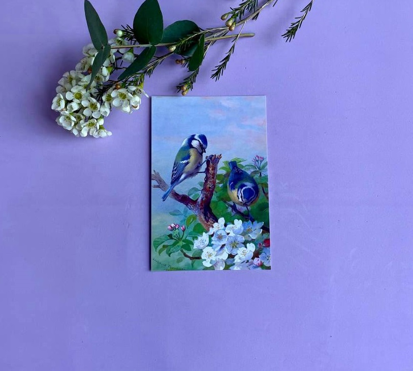Карточка с графичным рисунком птиц и местом для написания теплых слов. Лаконичный дизайн дополняет любую цветочную композицию без лишней декоративности.