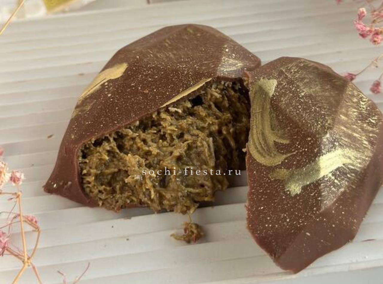 Форма сердца наполнена слоями молочного шоколада, фисташковой пасты и хрустящего теста Катаифи с кунжутной Тахини. Плотная текстура раскрывается постепенно, сочетая сливочность и ореховую глубину. Время создания 5 часов.