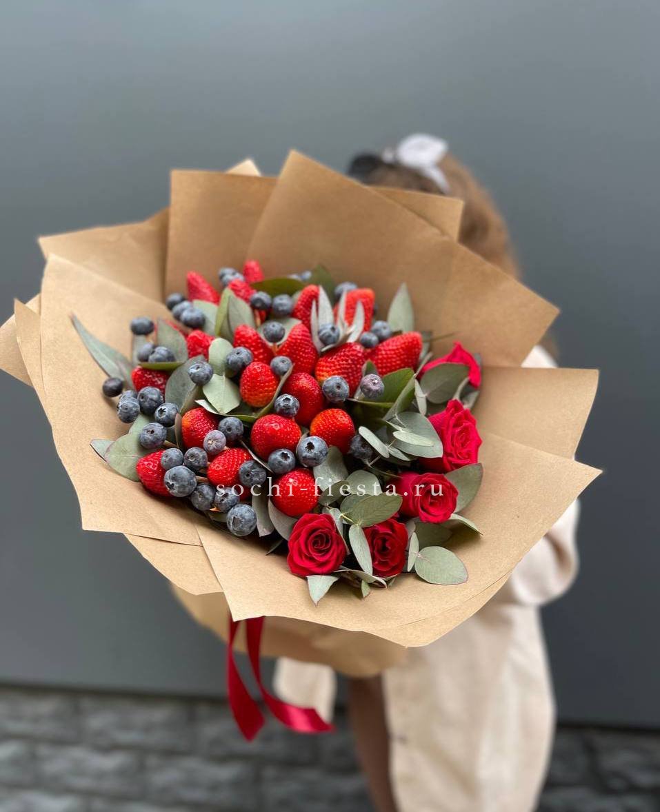 Пять алых роз соседствуют со свежей клубникой и россыпью голубики в естественной крафтовой обёртке. Зелень фисташки добавляет композиции лёгкости и воздуха. Сезонное сочетание цветов и ягод в одном букете.