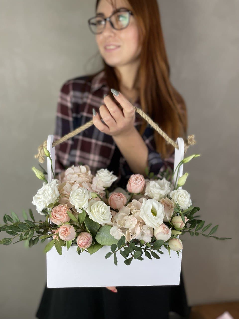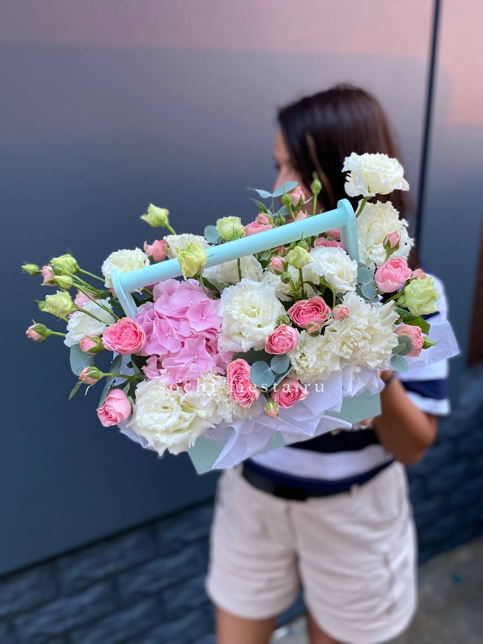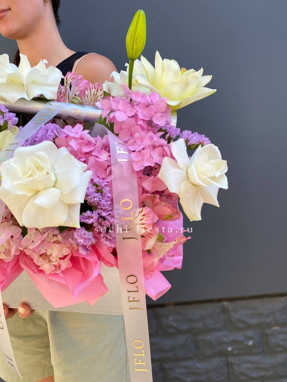 лилии, французские розы, гортензия, альстромерия, статица,деревянный ящик.