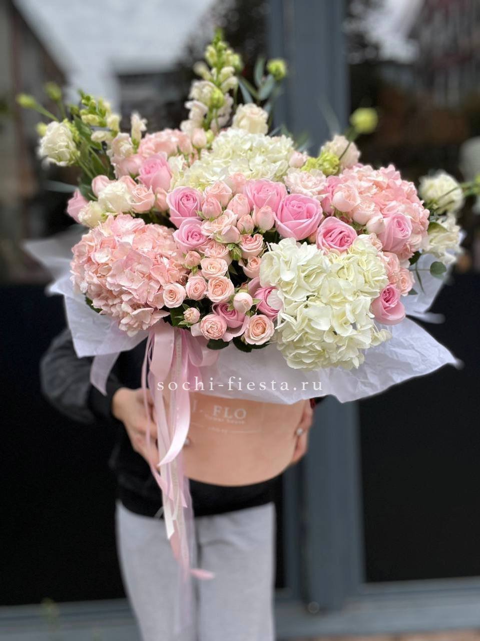 пионовидная роза, гортензия, эустома, декоративная зелень, бокс D20.
