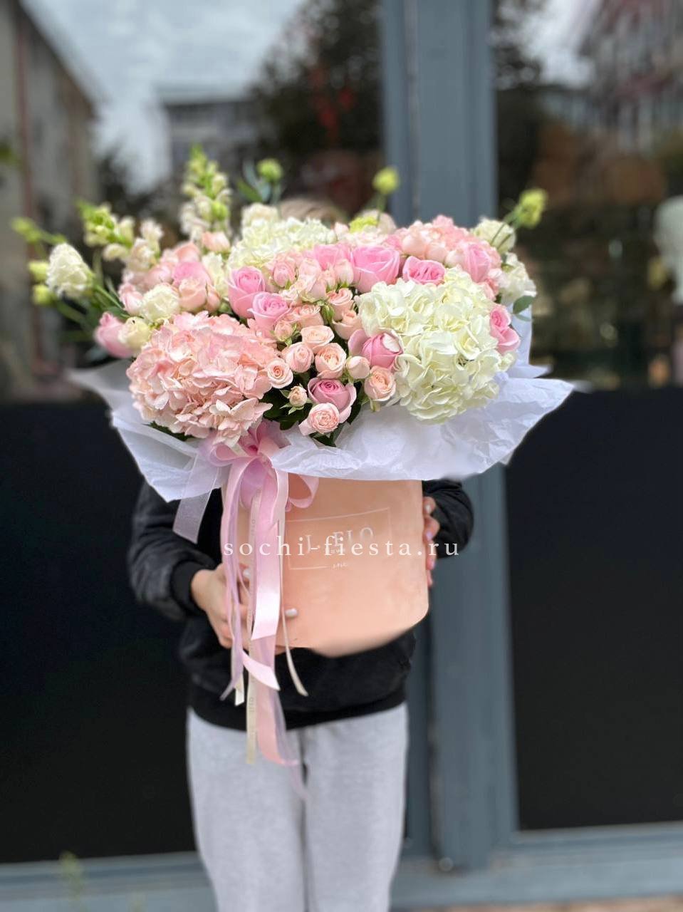 Пионовидные розы раскрываются пышными шапками среди воздушной гортензии и эустомы. Композиция собрана в круглом боксе и держит форму без дополнительной упаковки.
