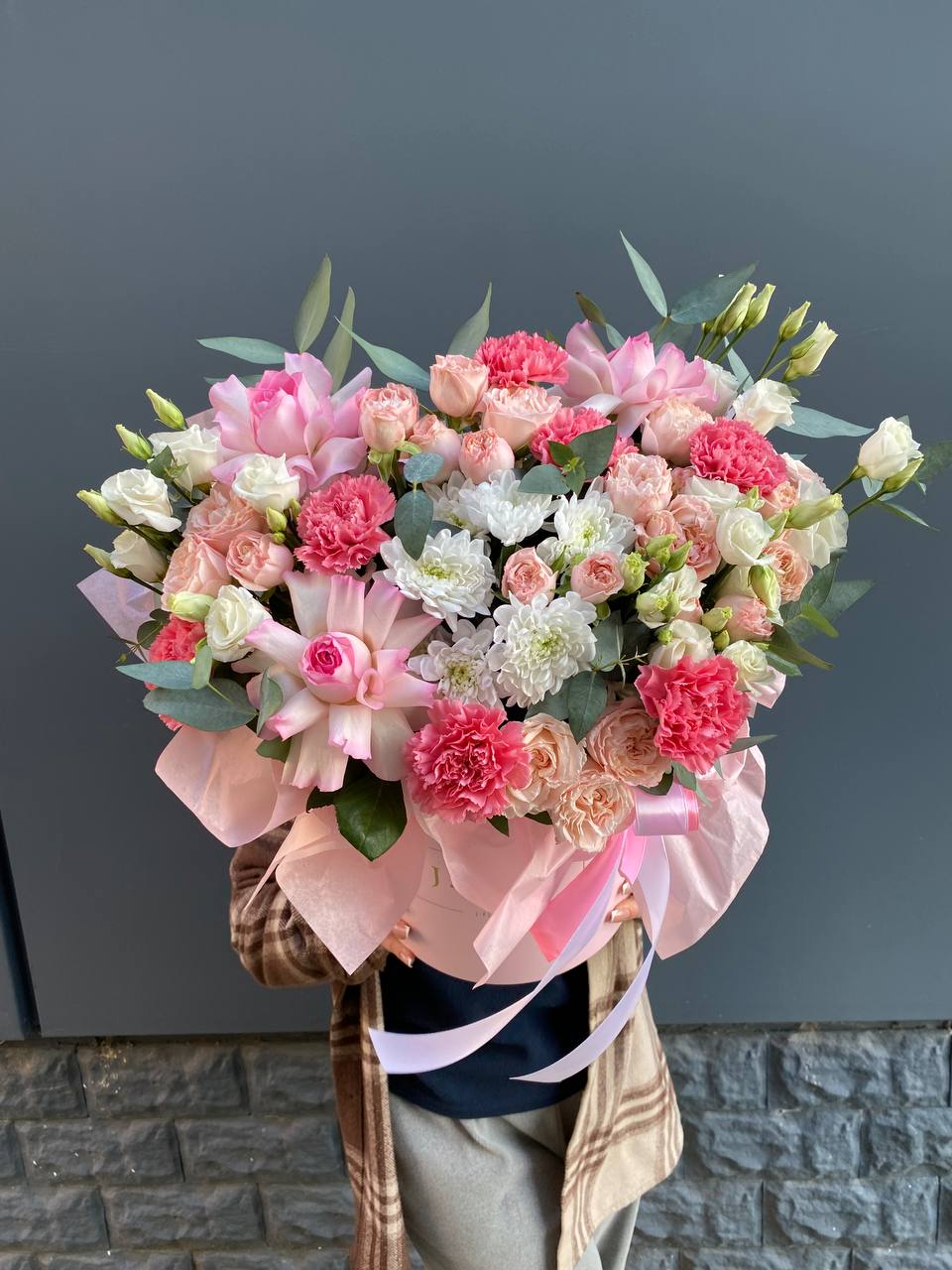 гортензия, вывернутые розы, диантус, кустовая роза, эустома, бокс D20, тишью.