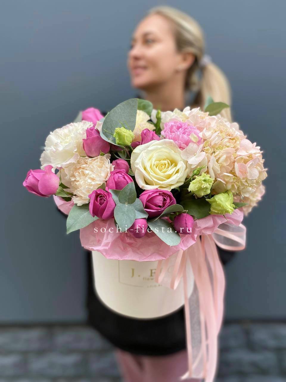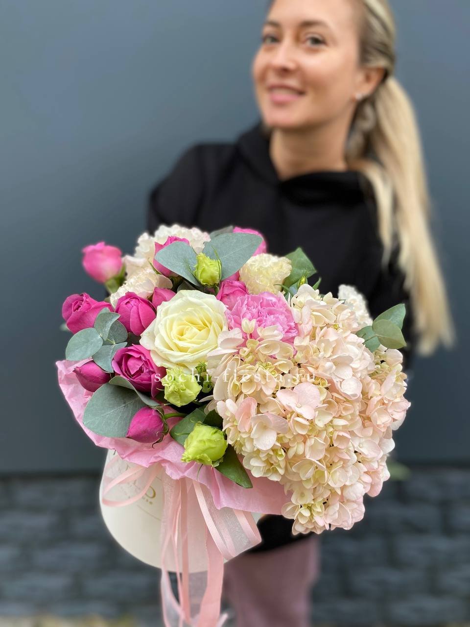 Воздушная композиция в пастельной гамме с акцентом на фактуру раскрытых бутонов. Пионовидные розы и эустома создают объёмный силуэт, а хлопок добавляет графичности.