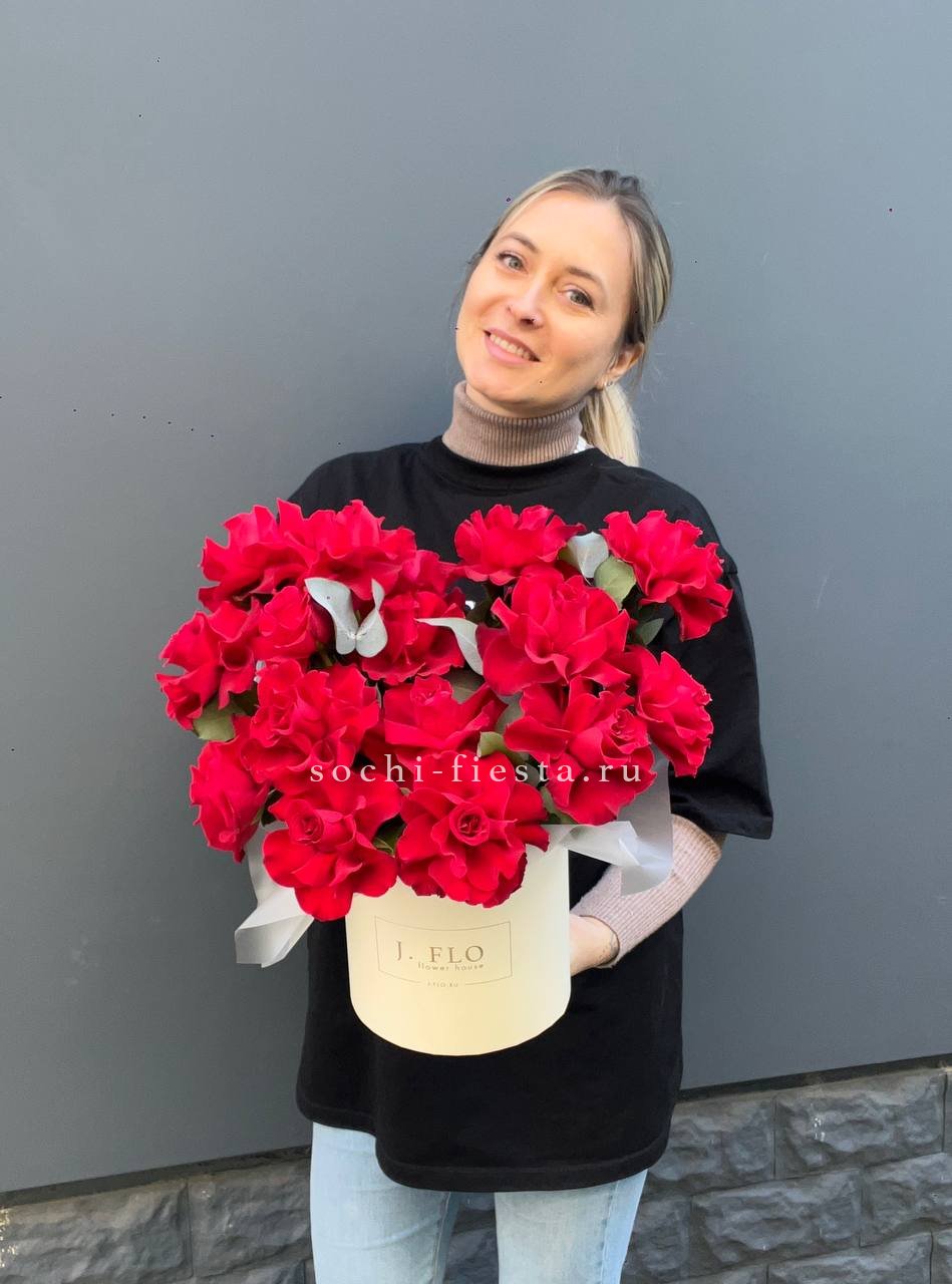 Пионовидная роза Бомбастик образует плотные бутоны с множеством лепестков. Эвкалипт добавляет свежести и завершает форму. Компактная коробка удобна для передачи из рук в руки.