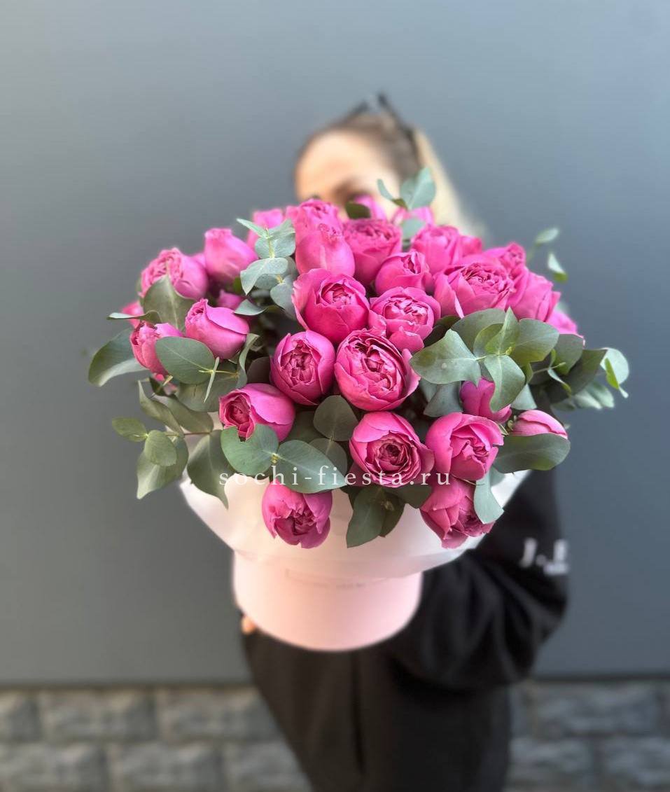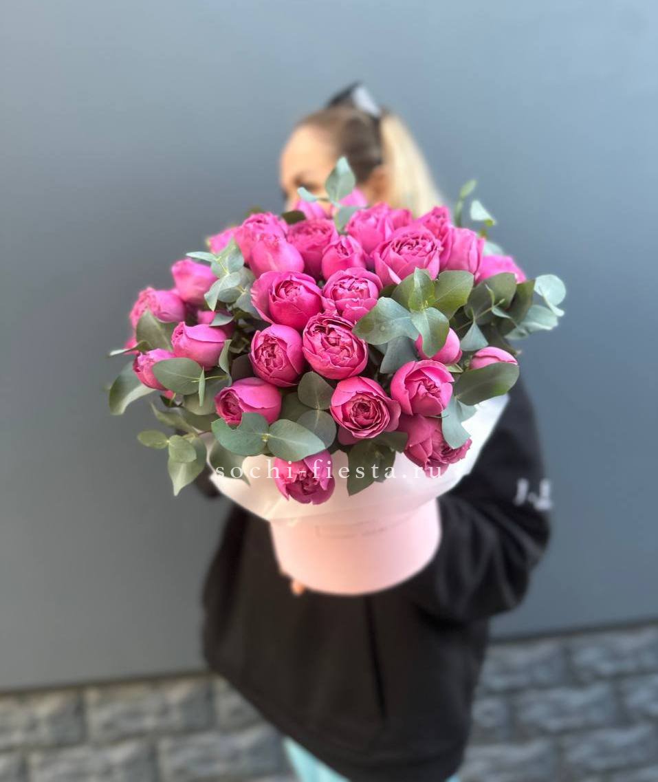 Белые пионовидные розы с объемными лепестками притягивают взгляд своей текстурной глубиной. Эвкалипт и бруния добавляют композиции природную легкость.