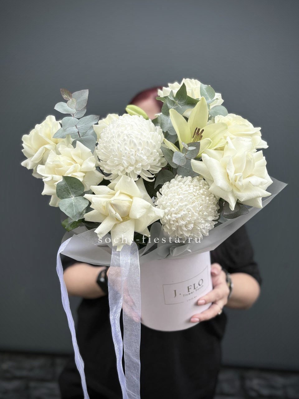 Масштабная композиция в цилиндре собирает пионовидные розы, гортензию и георгины в плотную объемную форму. Высота и диаметр создают выразительное присутствие в интерьере.