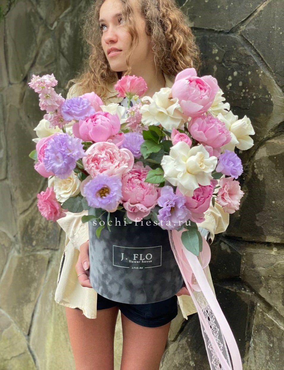 Пионы распускаются пышными шапками в окружении роз и душистой маттиолы. Эустома добавляет воздушности, а эвкалипт создает свежий акцент в цилиндре.