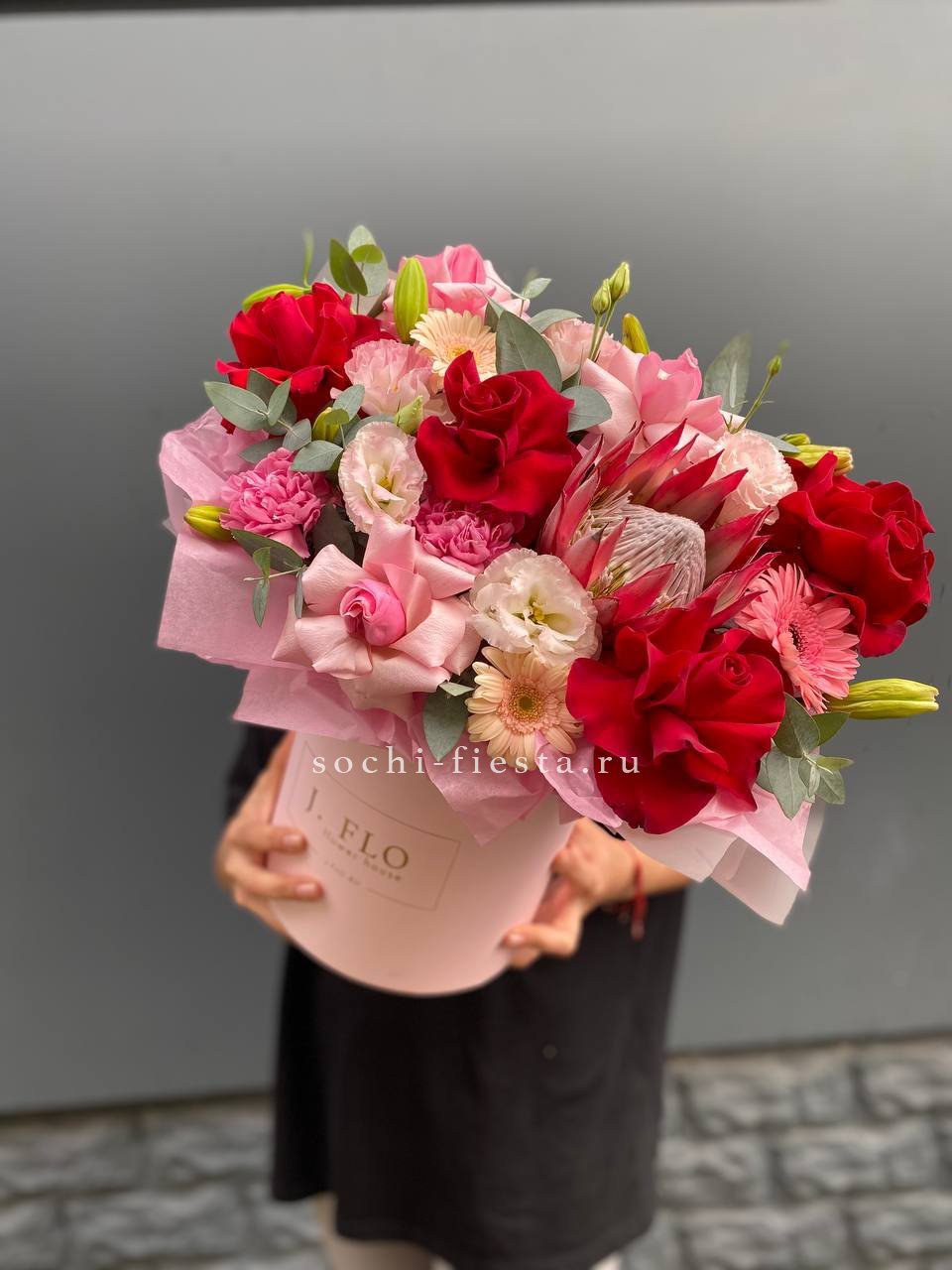 Яркая композиция объединяет экзотическую протею, солнечные герберы и пышные розы в одном насыщенном ритме. Каждый бутон раскрывается по-своему, создавая живую палитру теплых оттенков.