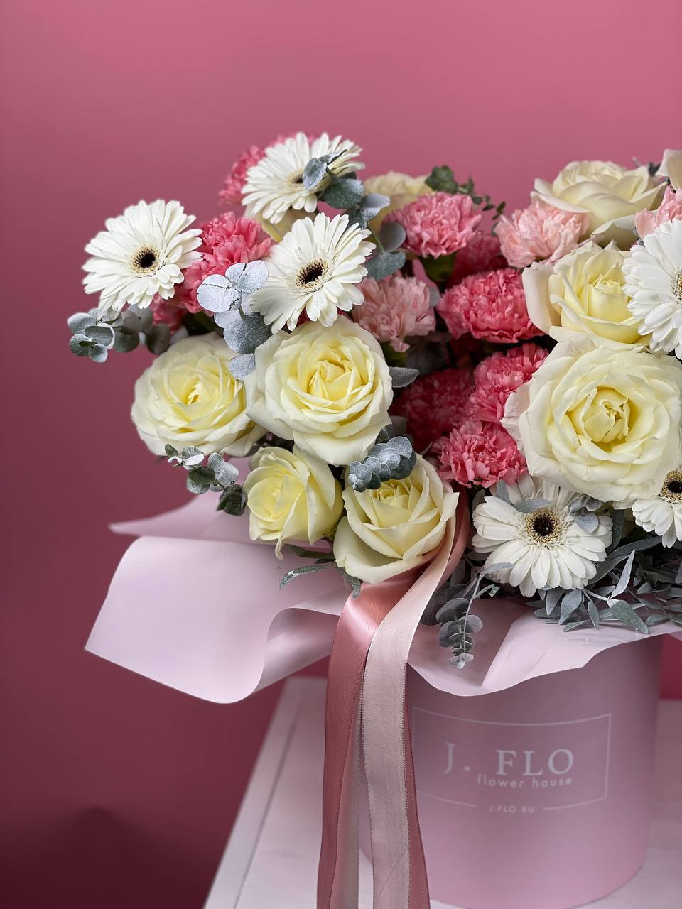 розы, протея, диантус, гербера, эустома, лилия, бокс 20.