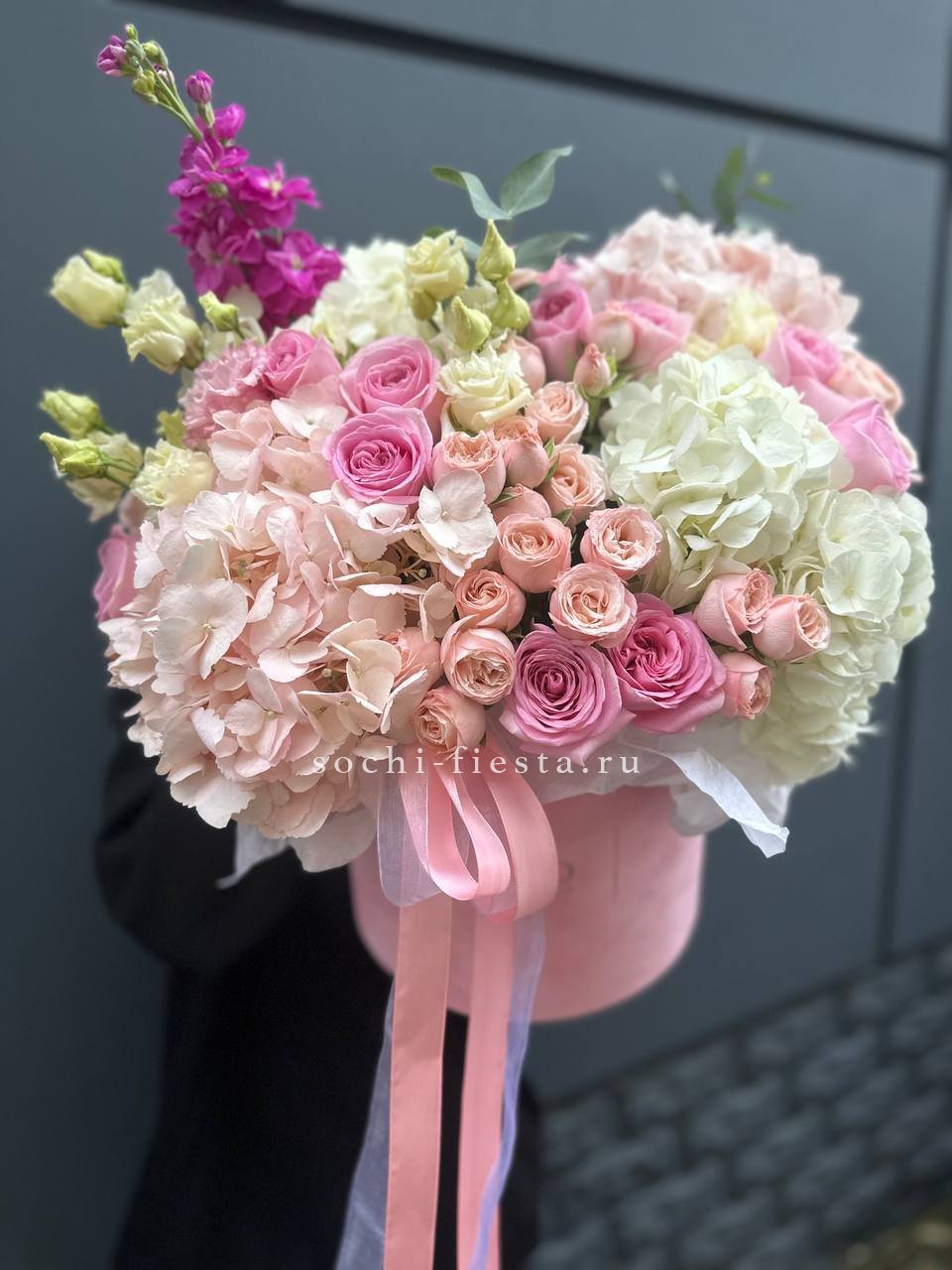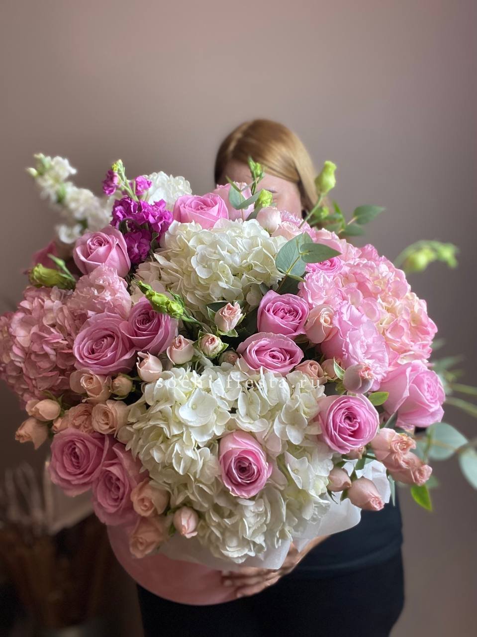 гортензия, пионовидные розы, эустома, эвкалипт, бокс 16.