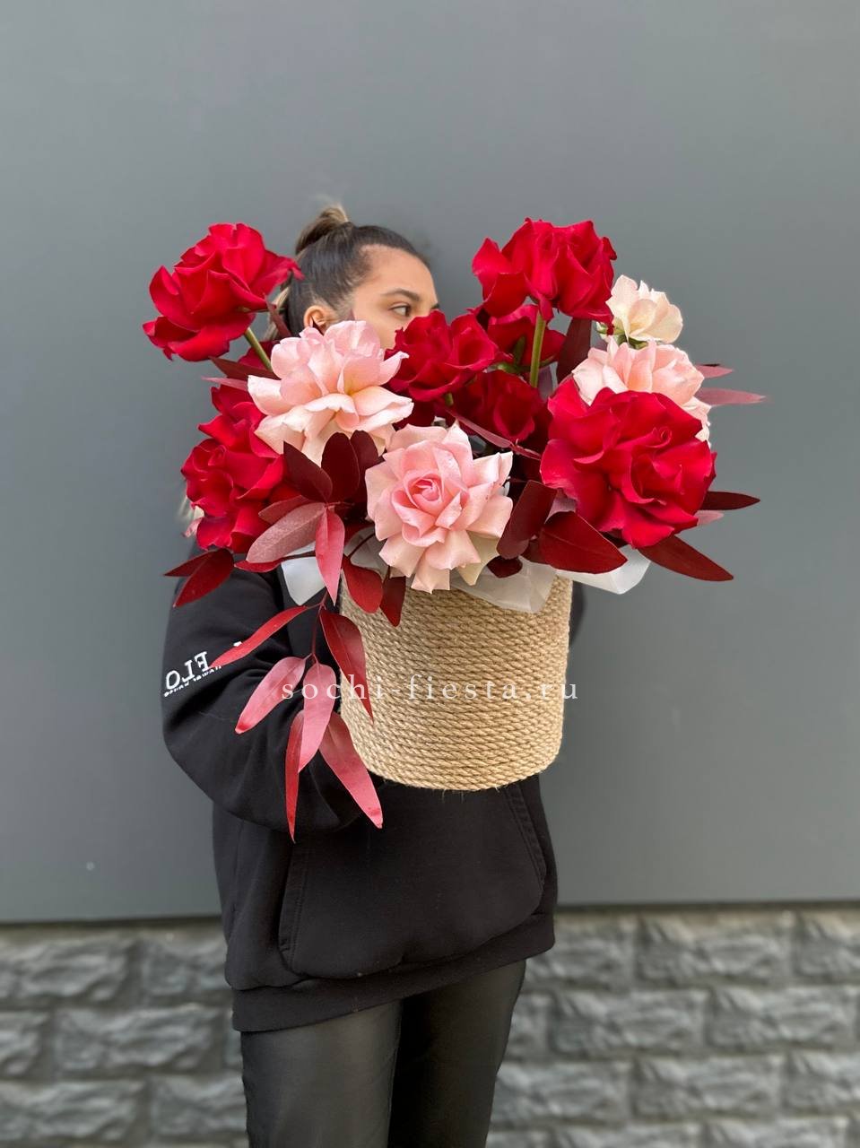 Французские розы теплого оттенка раскрываются в окружении эвкалипта и листьев Чико. Композиция в джутовом кашпо выглядит самодостаточно и гармонично вписывается в любое пространство.