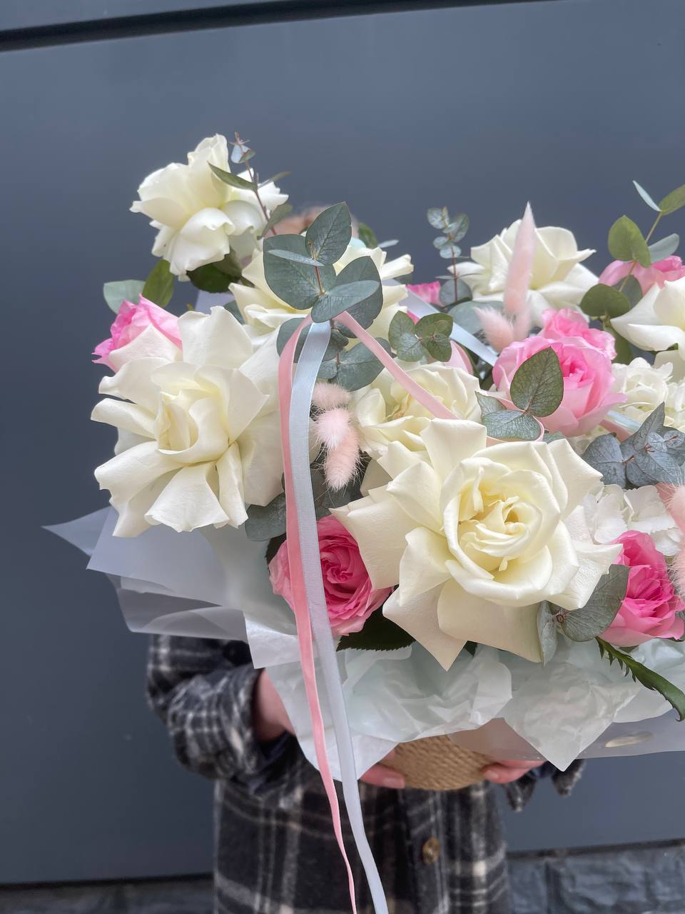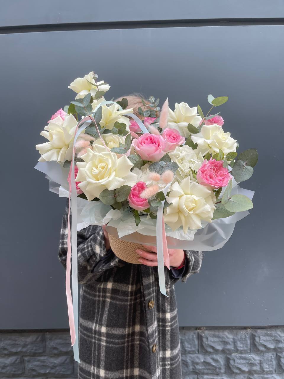 Белоснежные розы и воздушная гортензия создают объёмную композицию с мягкими переходами оттенков. Эустома и диантус добавляют фактурности, а лимониум заполняет пространство между крупными бутонами.