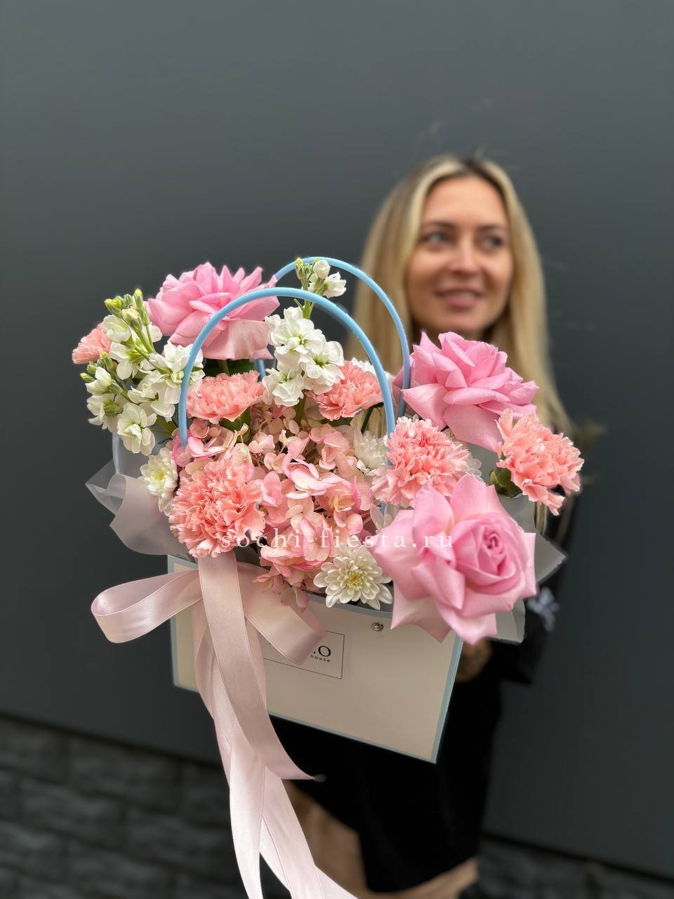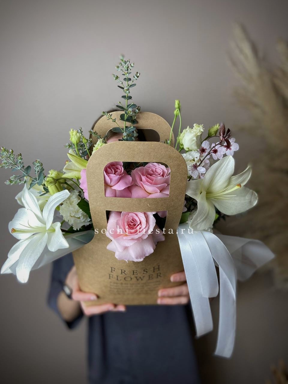 пионовидные розы мисти бабблс, диантусы, белая роза, хлопок, лента, сумка-кашпо.