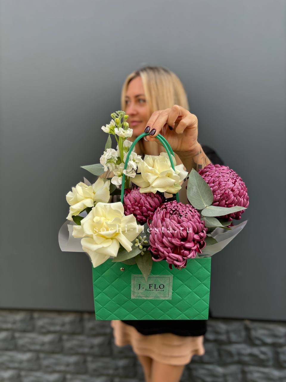 Хризантемы бигуди с их игривой текстурой задают ритм всей композиции. Маттиола добавляет мягкости, а розы завершают образ. Всё это собрано в удобной сумке, готовой к переноске.