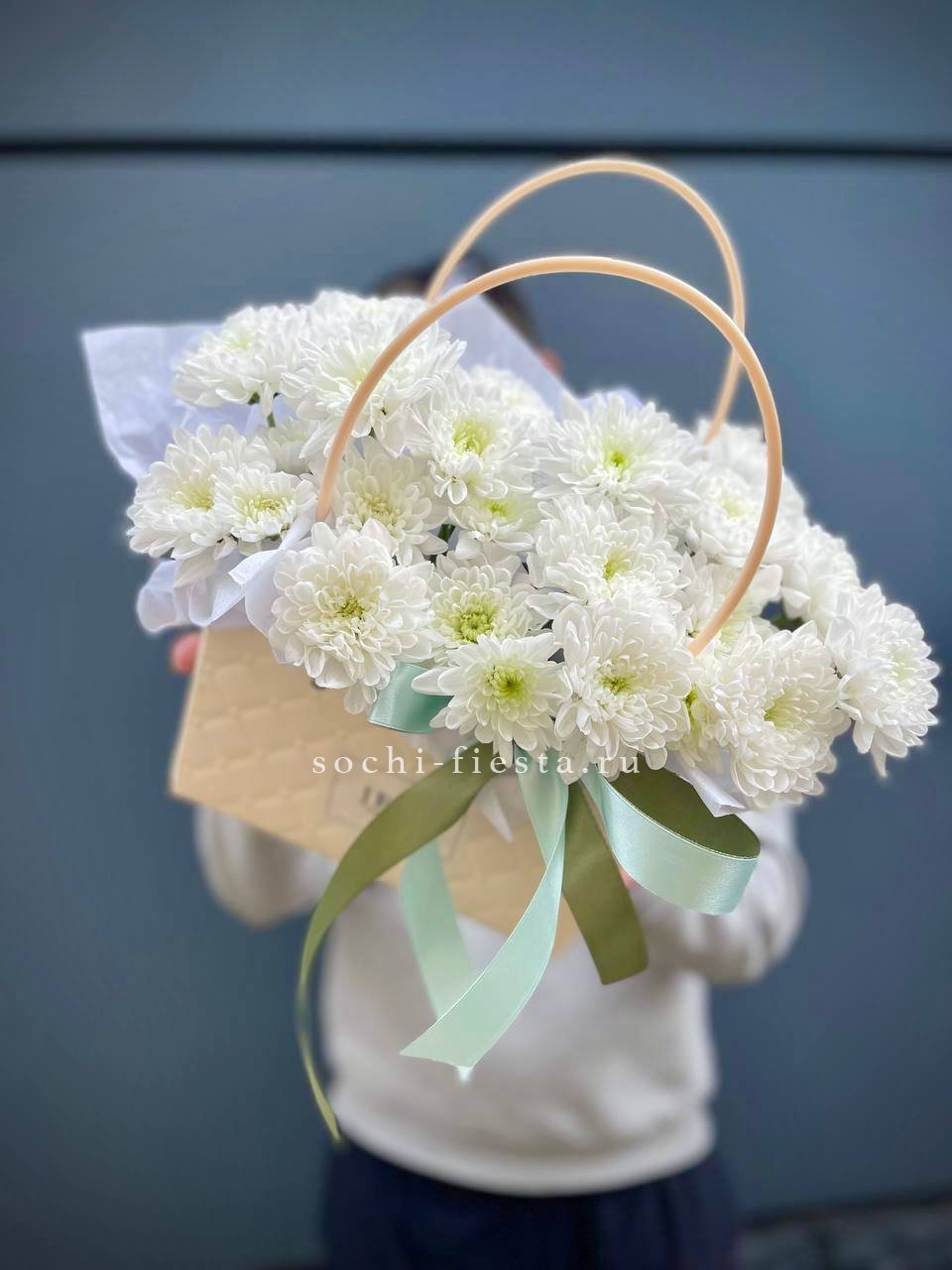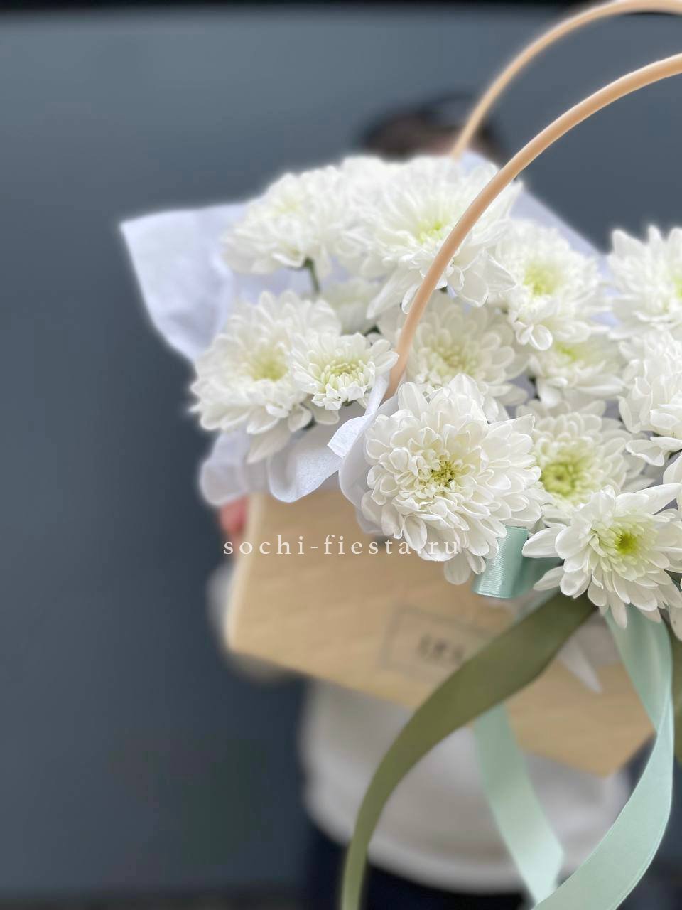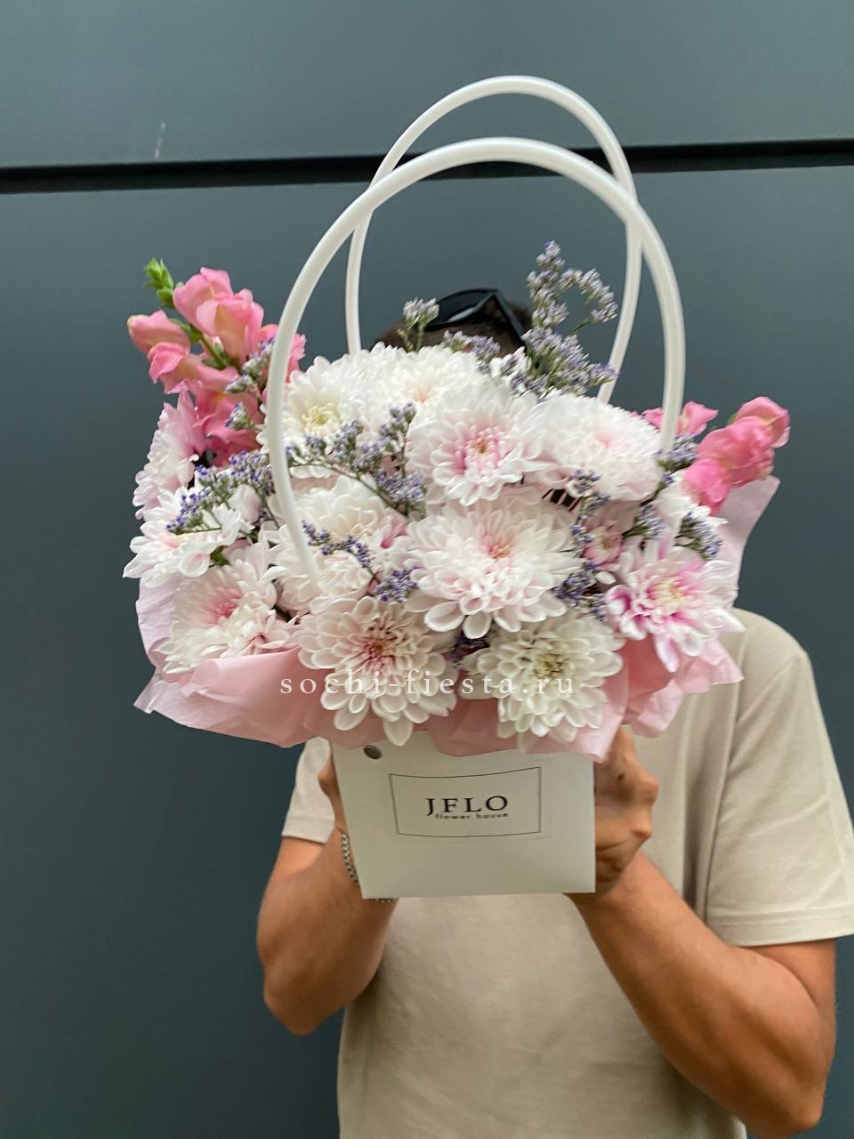 Герберы и маттиола вместе с диантусами выстраивают вертикальный ритм в flower bag. Белая роза и кустовая хризантема добавляют композиции завершенность.