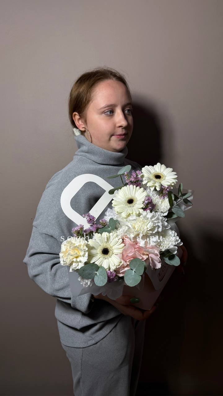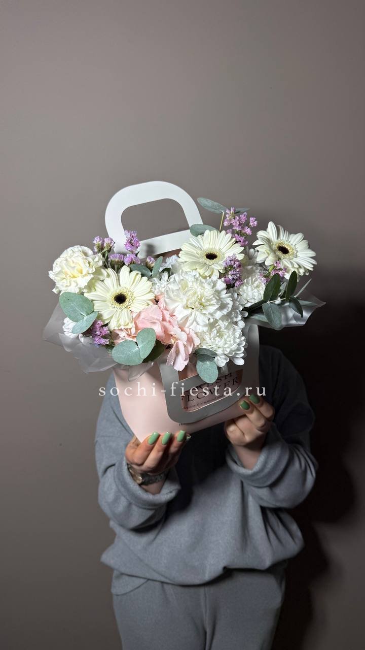 Белоснежные хризантемы и эустома создают светлое облако, которое разбавляют акценты гербер и душистой маттиолы. Композиция в сумочке готова к вручению сразу после получения.