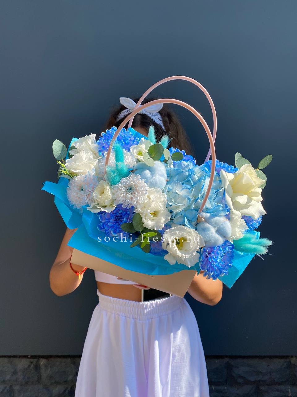 гортензия, джумилия, гербера, сумочка.