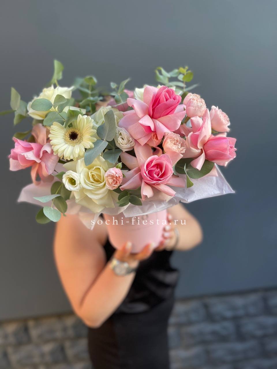 Герберы и розы двух оттенков выстроены плотными рядами в компактном боксе. Бомбастик придает текстуру, а эустома смягчает линии композиции.