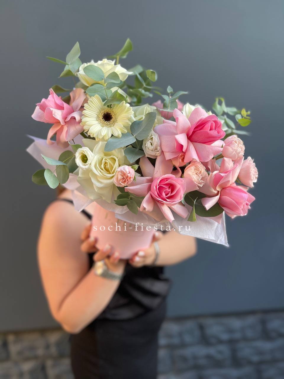 гербера, розовая роза, бомбастик, белая роза, эустома, бокс 13.