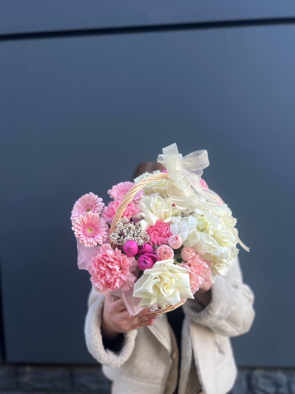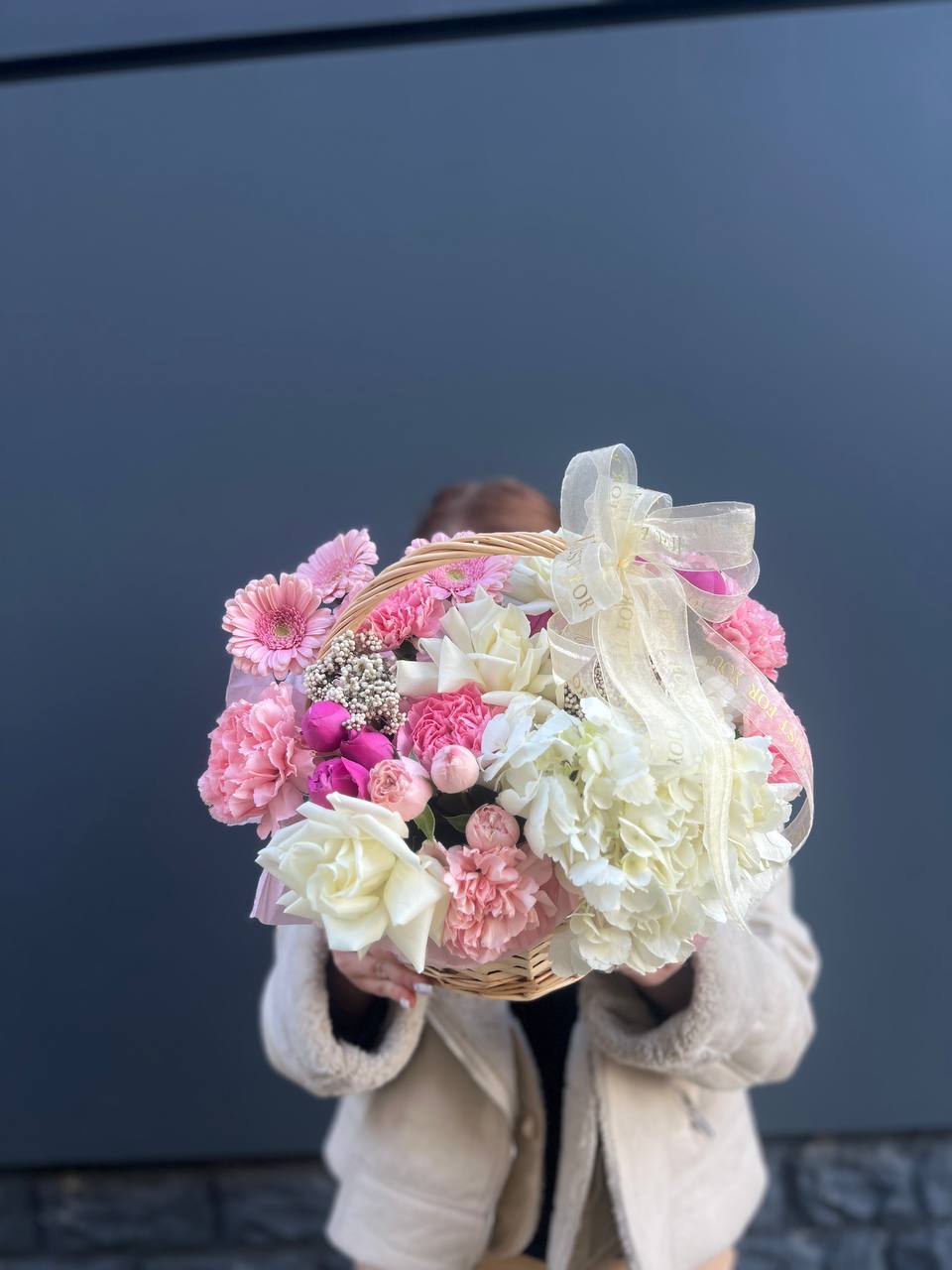 гортензия, диантус, розовая роза, эустома, гербера, корзина средняя, наполнение.