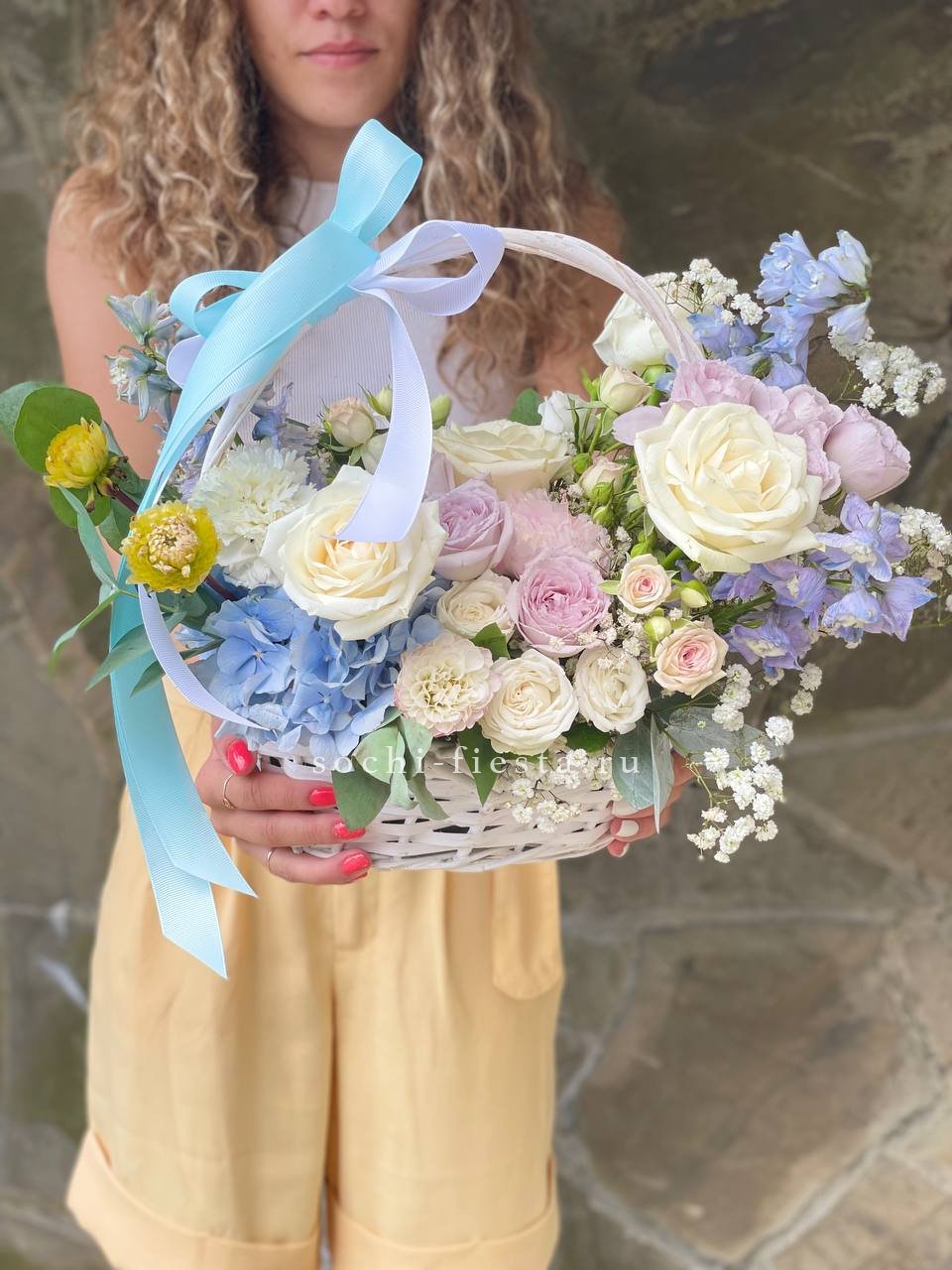 Корзина с шестьюдесятью пятью кустовыми розами Мисти Бабблс создаёт плотное облако из махровых бутонов лавандового оттенка. Эвкалипт добавляет свежести и завершает композицию.