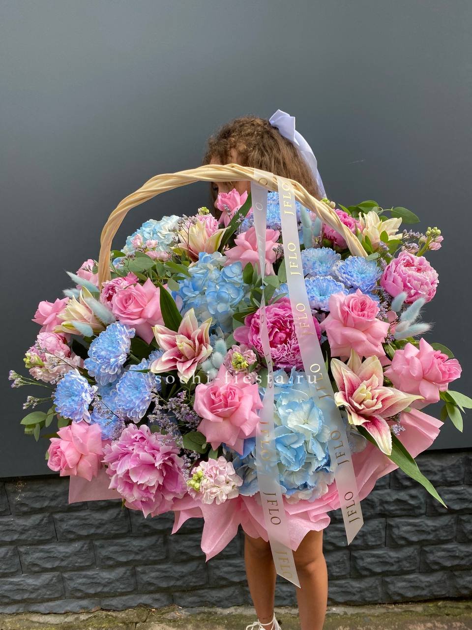 гортензии, лилии, хризантемы, пионы, лимониум, маттиола, корзина.