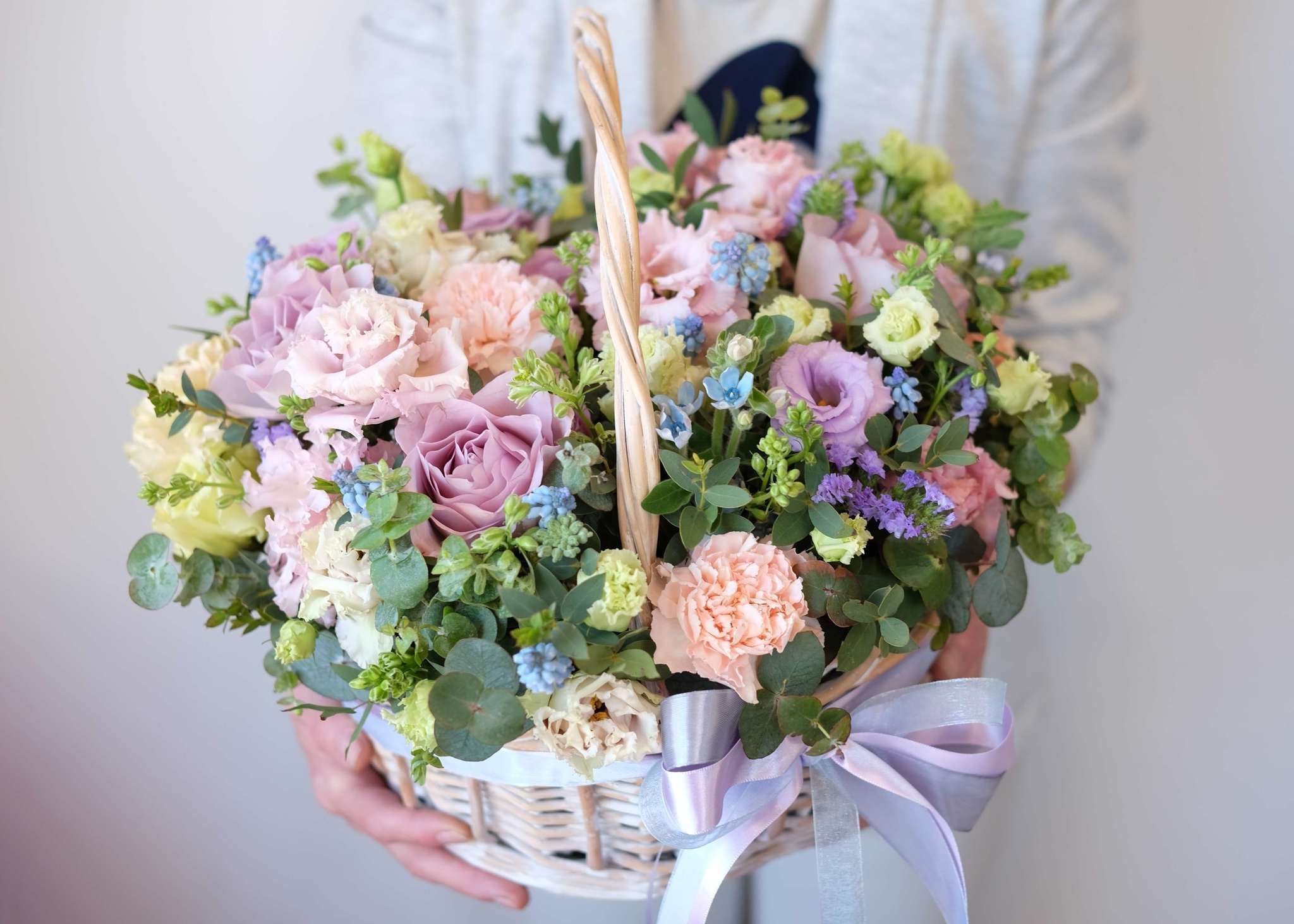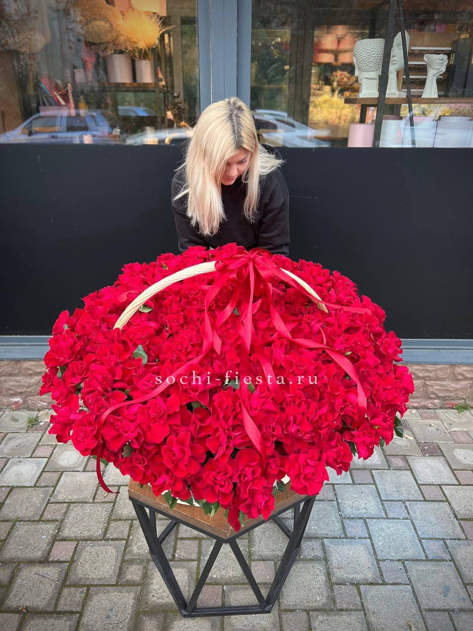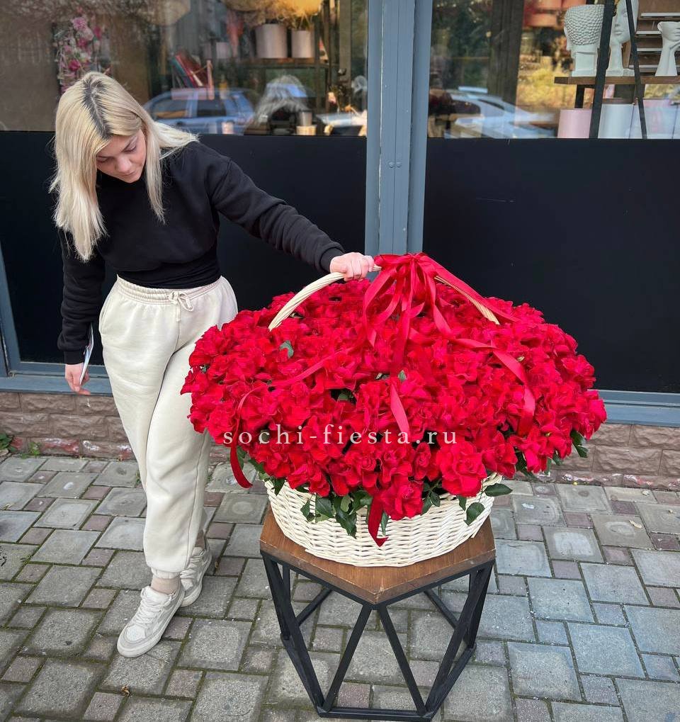 Корзина вмещает двести один бутон, образующих пышное цветочное полотно. Классическая форма подачи позволяет разместить композицию в любом пространстве без необходимости искать вазу. Впечатляющий объем для важных событий.