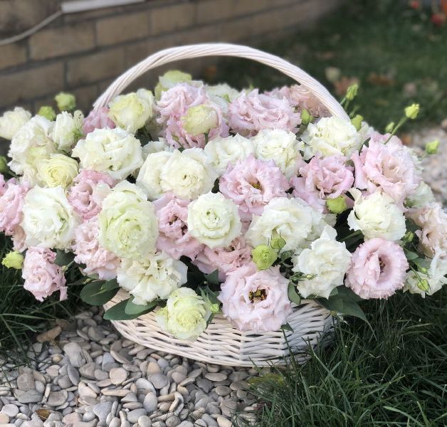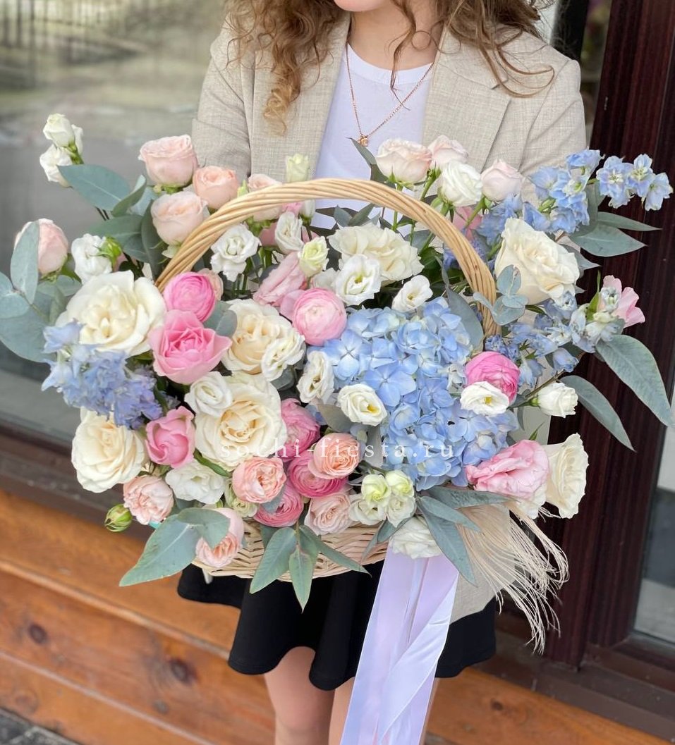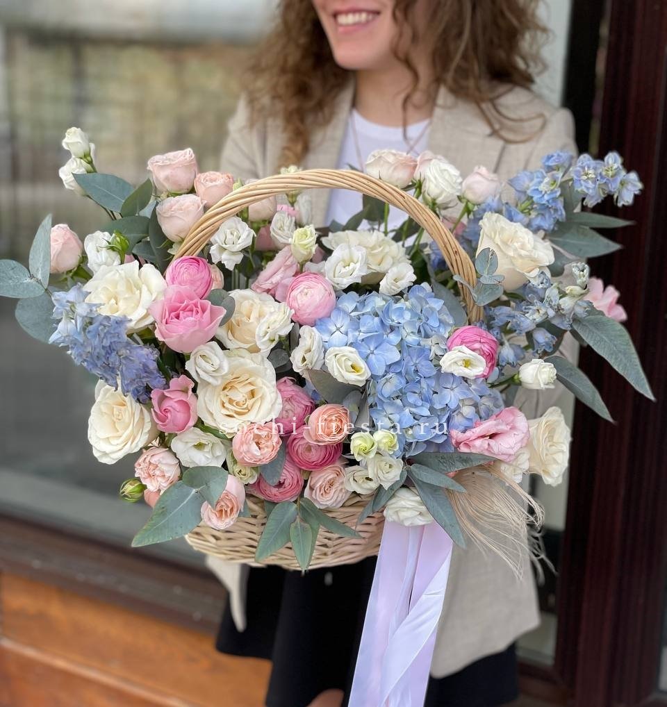 Корзина объединяет гортензии, эустомы, розы и маттиолу в многослойную композицию. Разные фактуры лепестков создают визуальную глубину и насыщенность.