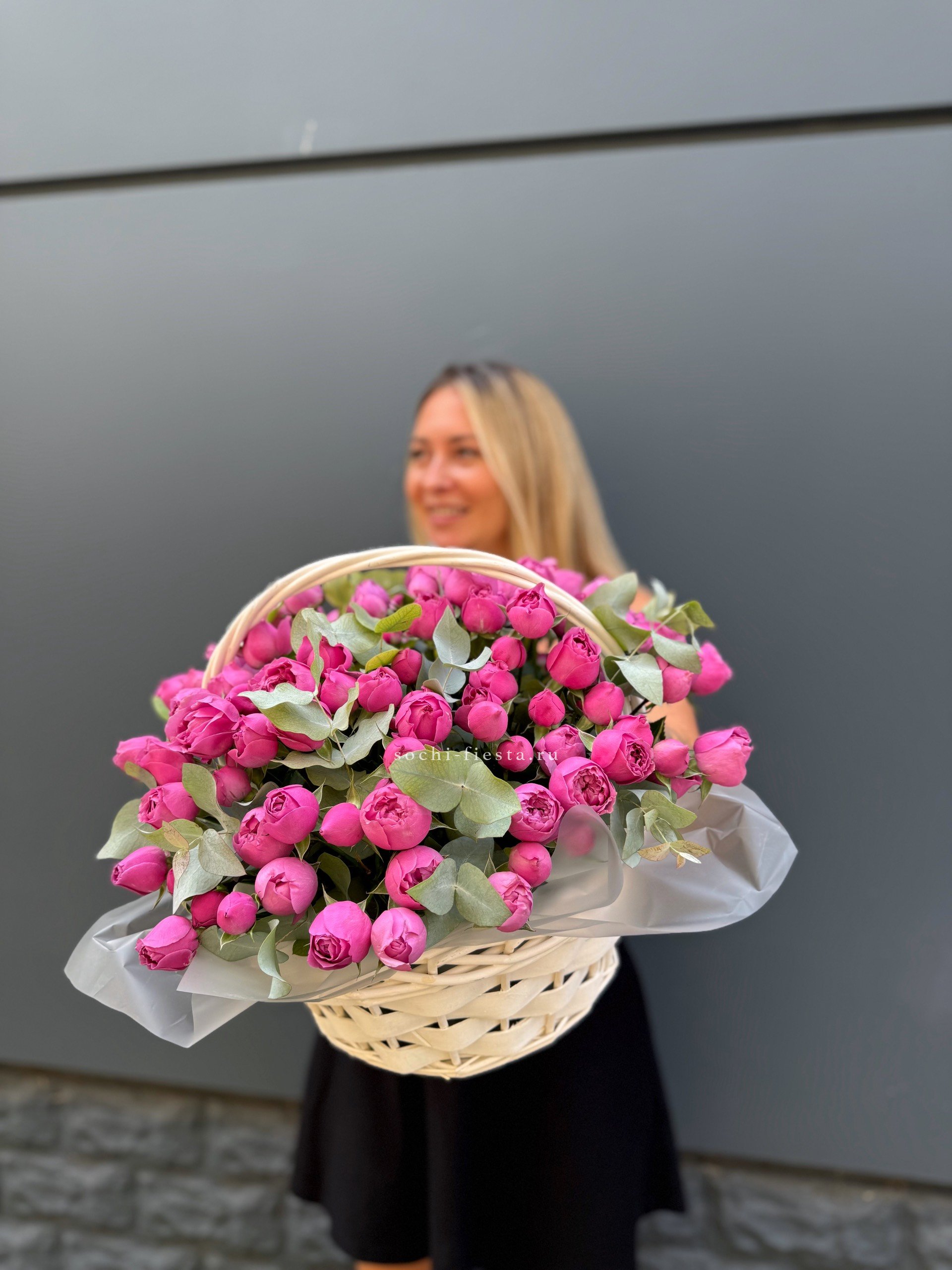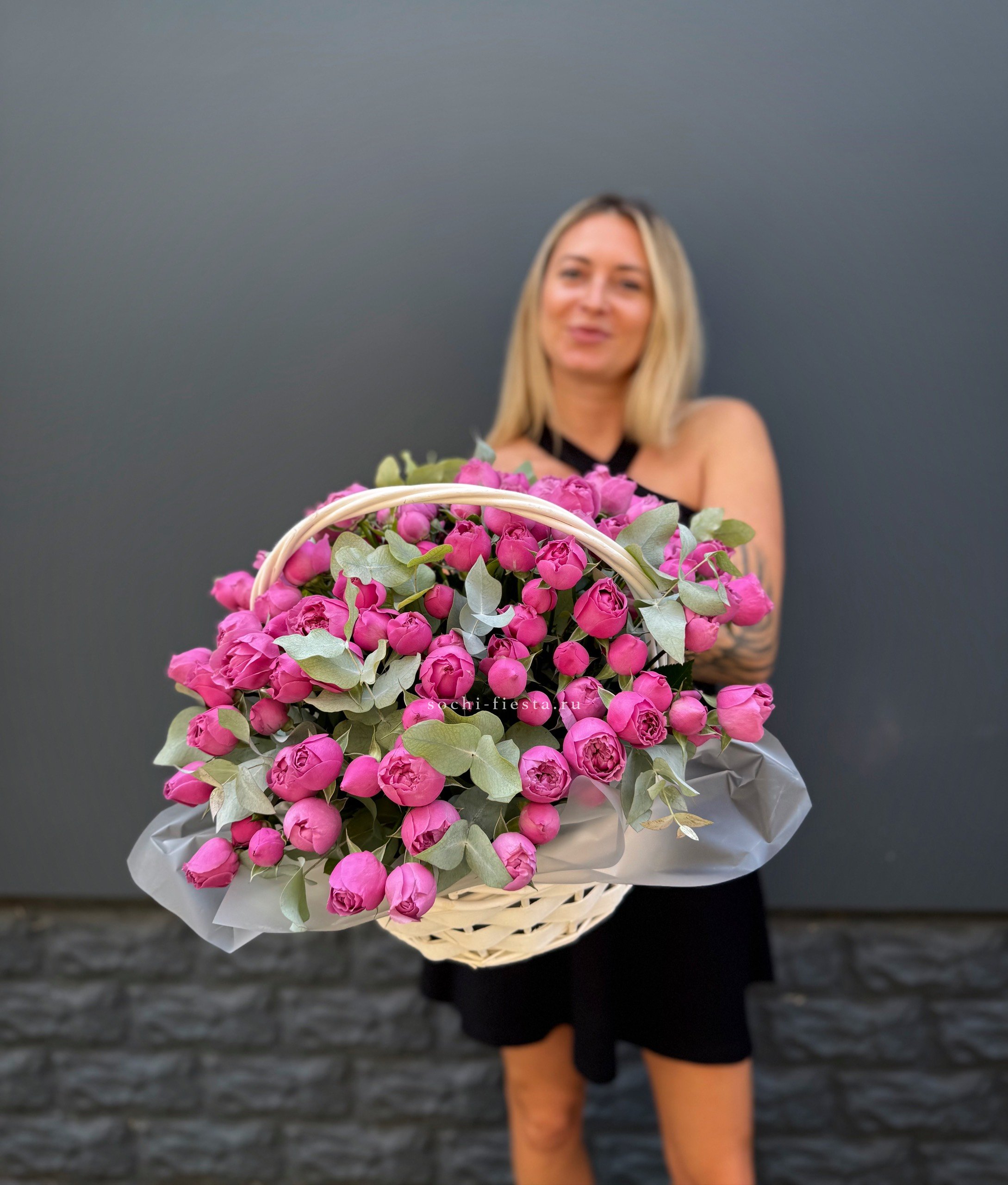 гортензия, эустома, розы, маттиола (дельфиниум или аналоги), кустовые розы, лента, корзина D40.