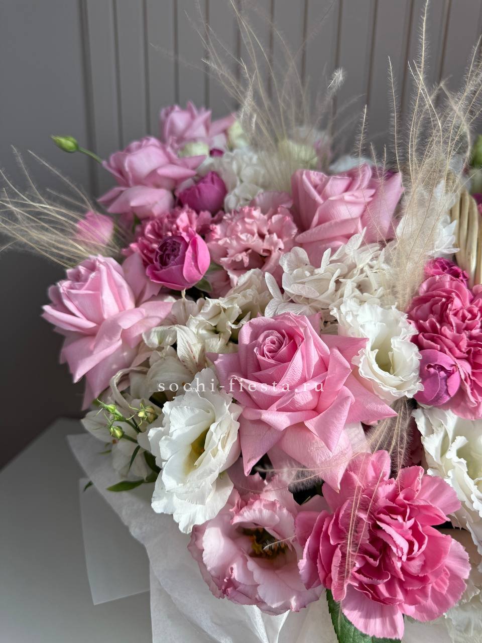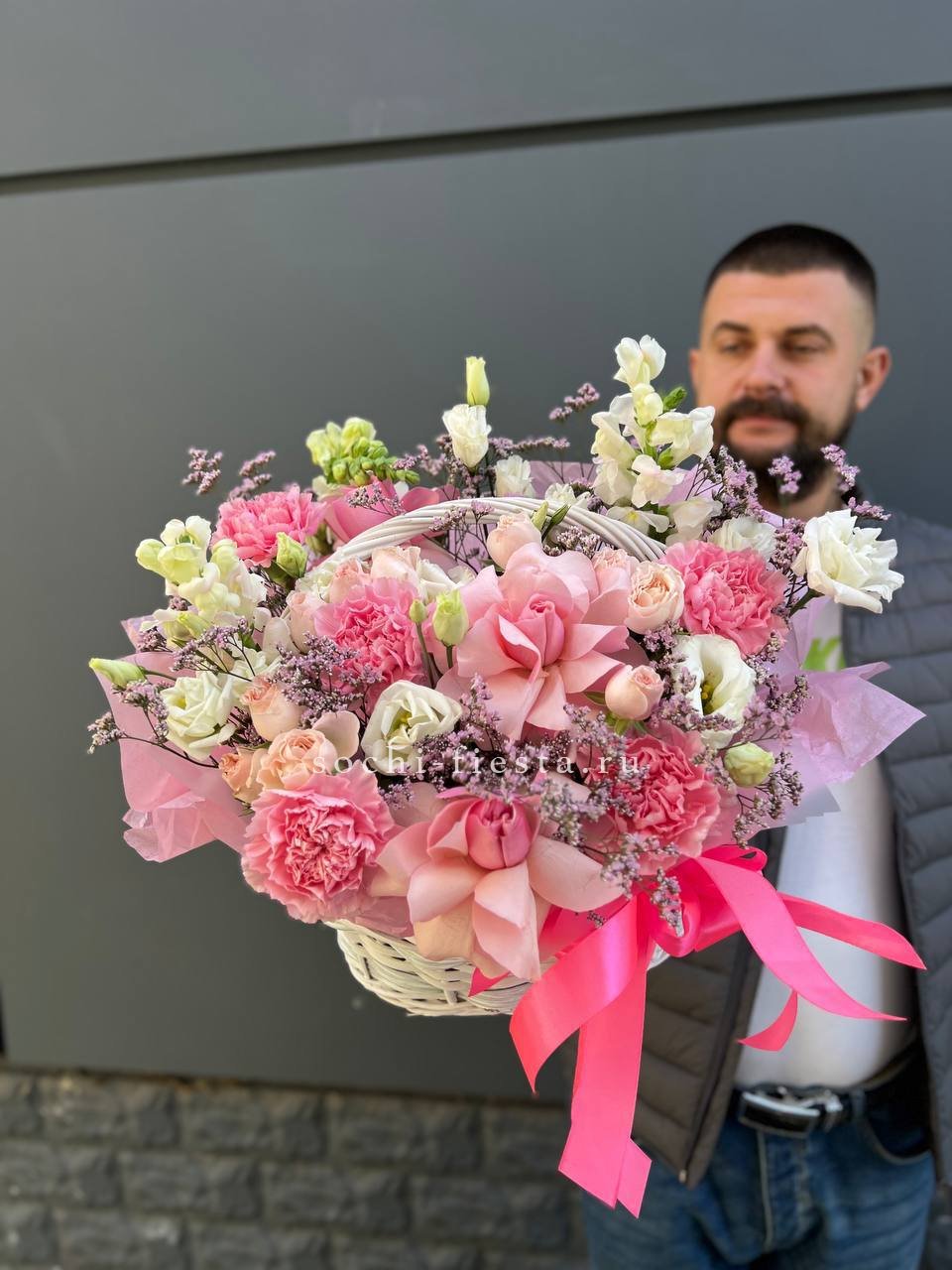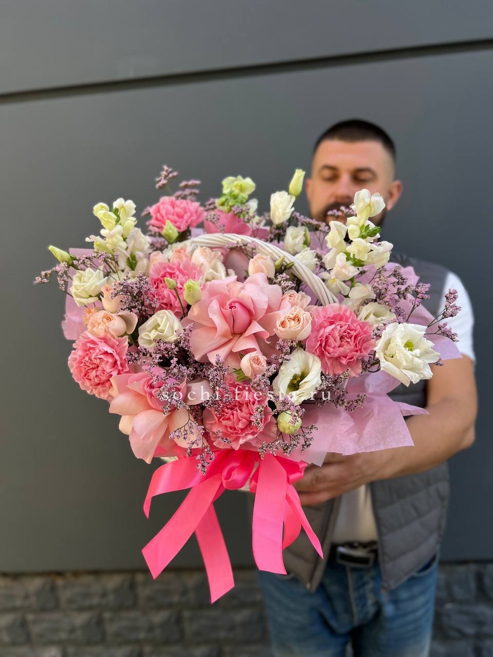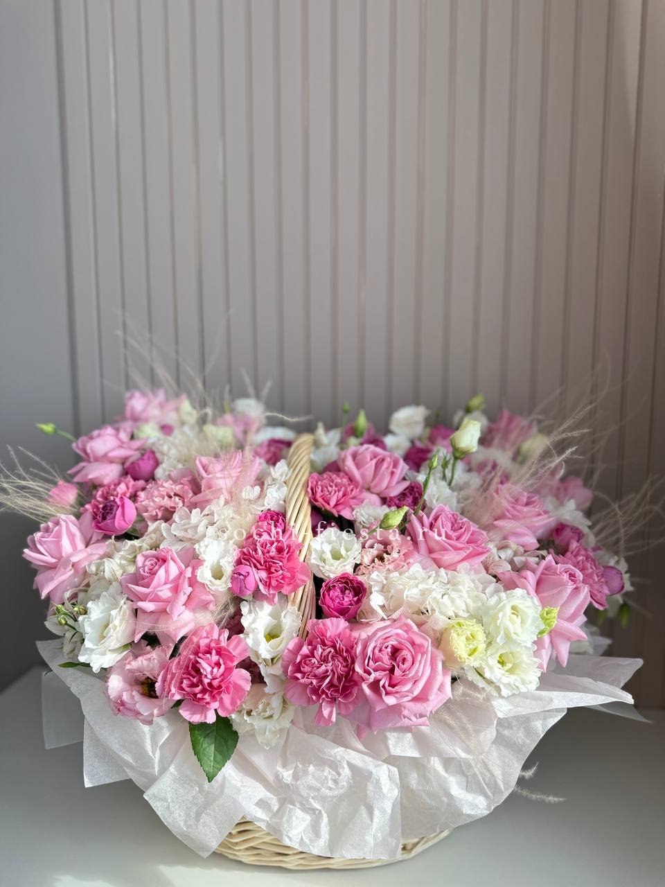 Пышная корзина с розами и гортензией раскрывается мягкими переходами розовых тонов. Эустома и диантус добавляют воздушности, а эвкалипт создает свежую основу для многослойной композиции. Авторская работа для важных событий и значимых встреч.